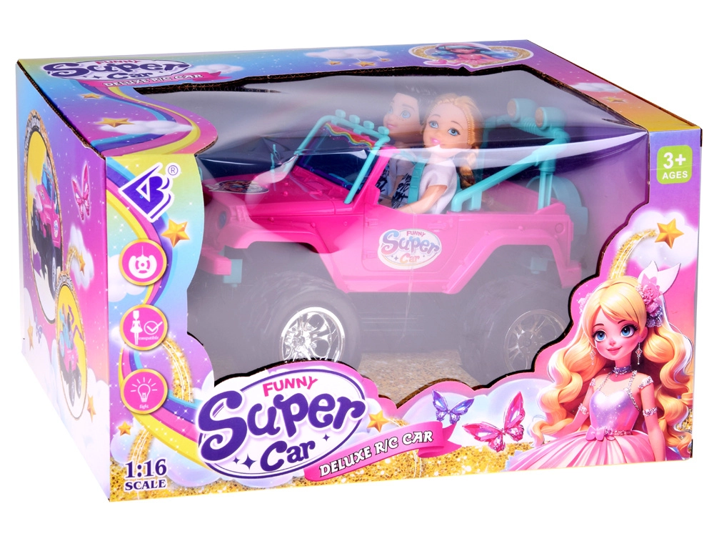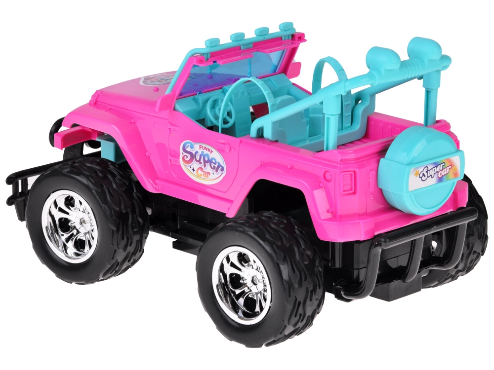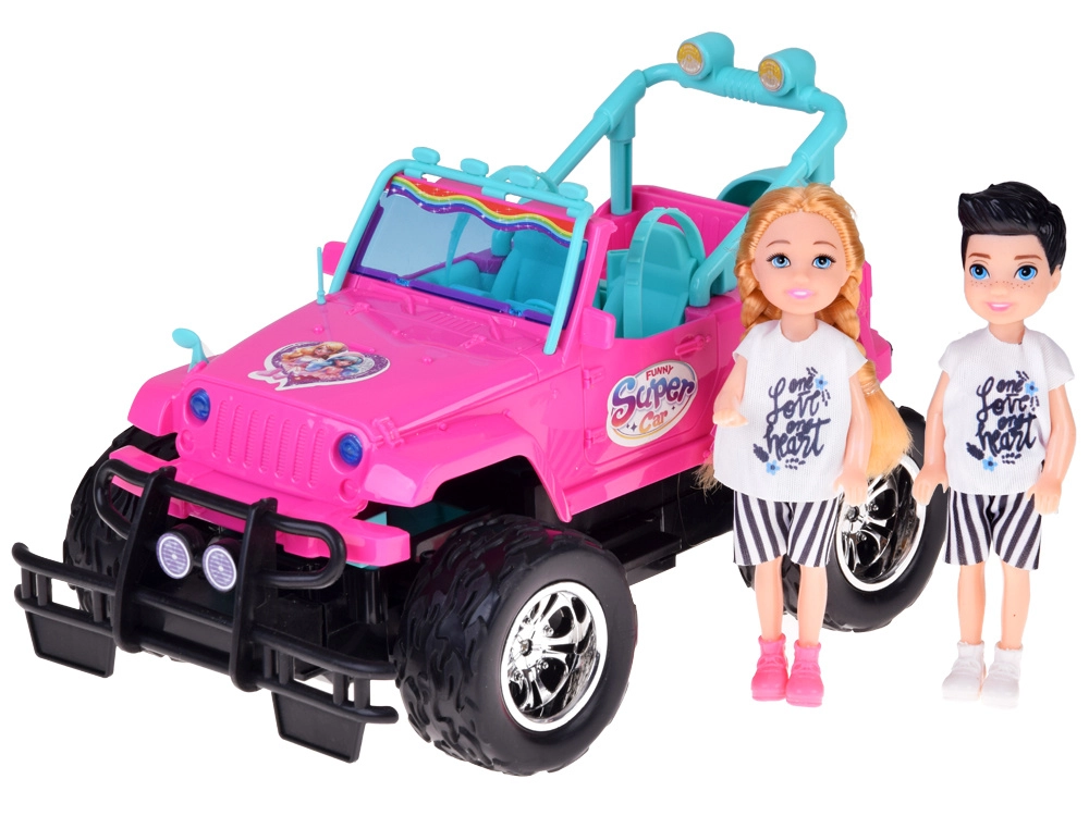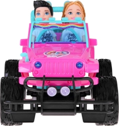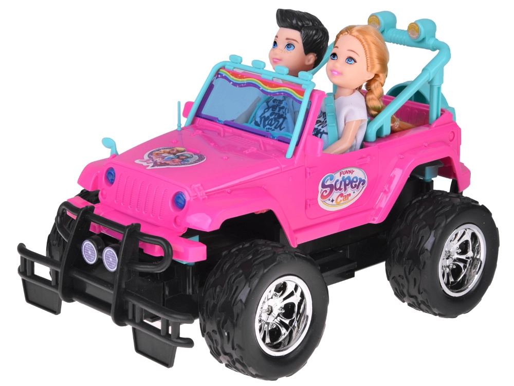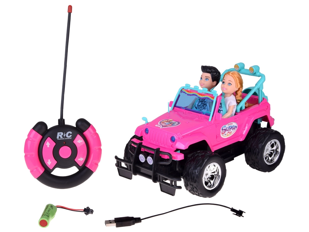Set distractiv pentru mici șoferi și șoferițe: mașină RC off-road roz cu roți mari și două figurine (fată și băiat). Mașina are faruri frontale luminoase, anvelope din cauciuc pentru aderență bună, centuri de siguranță reglabile pe scaune și control în 4 direcții cu ajutorul unui controller roz. Este inclus un acumulator de 3,7 V cu încărcare USB.