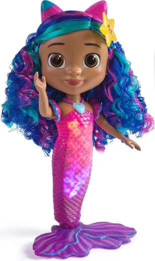 Descoperă magia cu păpușa Sirenă Gabina inspirată de filmul Căsuța fermecată a Gabrinei. Această păpușă mare, de aproximativ 35 cm, oferă efecte luminoase în coadă, până la 14 sunete și fraze la apăsarea colierului în formă de inimă și este rezistentă la apă pentru joacă în cadă sau la piscină. Datorită părului bogat și colorat, accesoriilor stilate și bateriilor incluse, este gata imediat pentru aventuri magice.