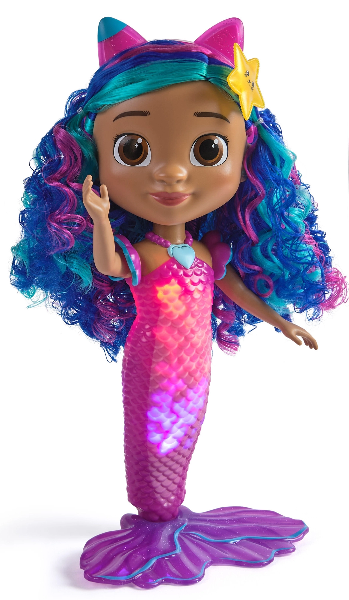 Păpușa este rezistentă la apă, astfel încât copiii se pot distra și în apă. Cu părul ondulat albastru‑mov evidențiat cu șuvițe roz, diadema roz cu urechiușe de pisică și accesoriul în formă de stea de mare, este ideală pentru joacă creativă, coafare și expunere. Coada cu textură de solzi și aripă lată asigură o postură stabilă pe suprafețe plane.