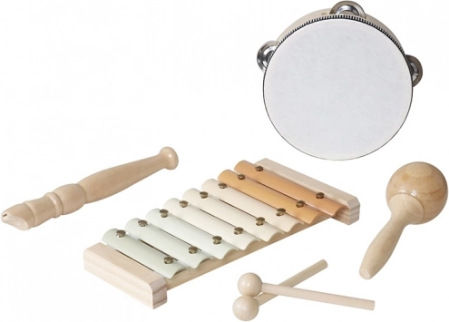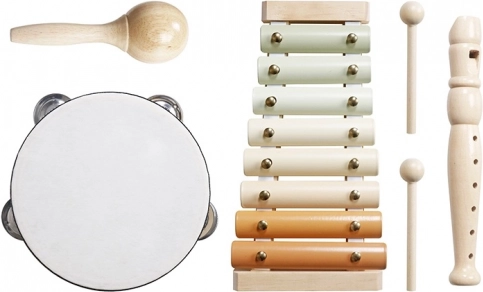 Tamburină, maracas, fluier și xilofon cu bețe oferă copiilor o gamă variată de sunete și posibilități de joacă.