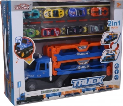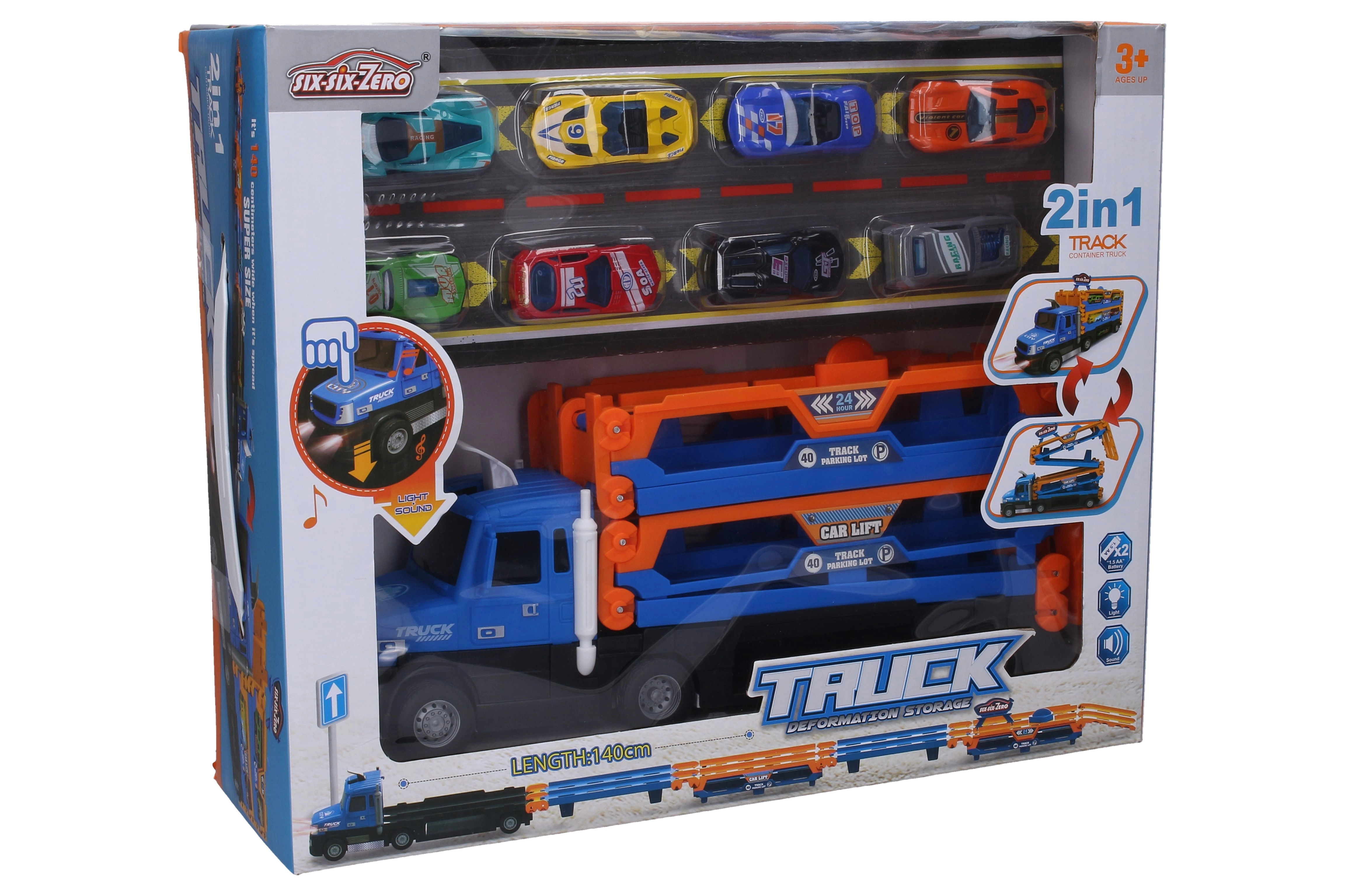 Pachetul include 8 mașinuțe metalice (aprox. 6,5 cm) cu roți care se rotesc liber, astfel încât sunteți gata de cursă imediat după despachetare. În stare pliată, autocamionul are dimensiuni compacte, ceea ce facilitează transportul și depozitarea.