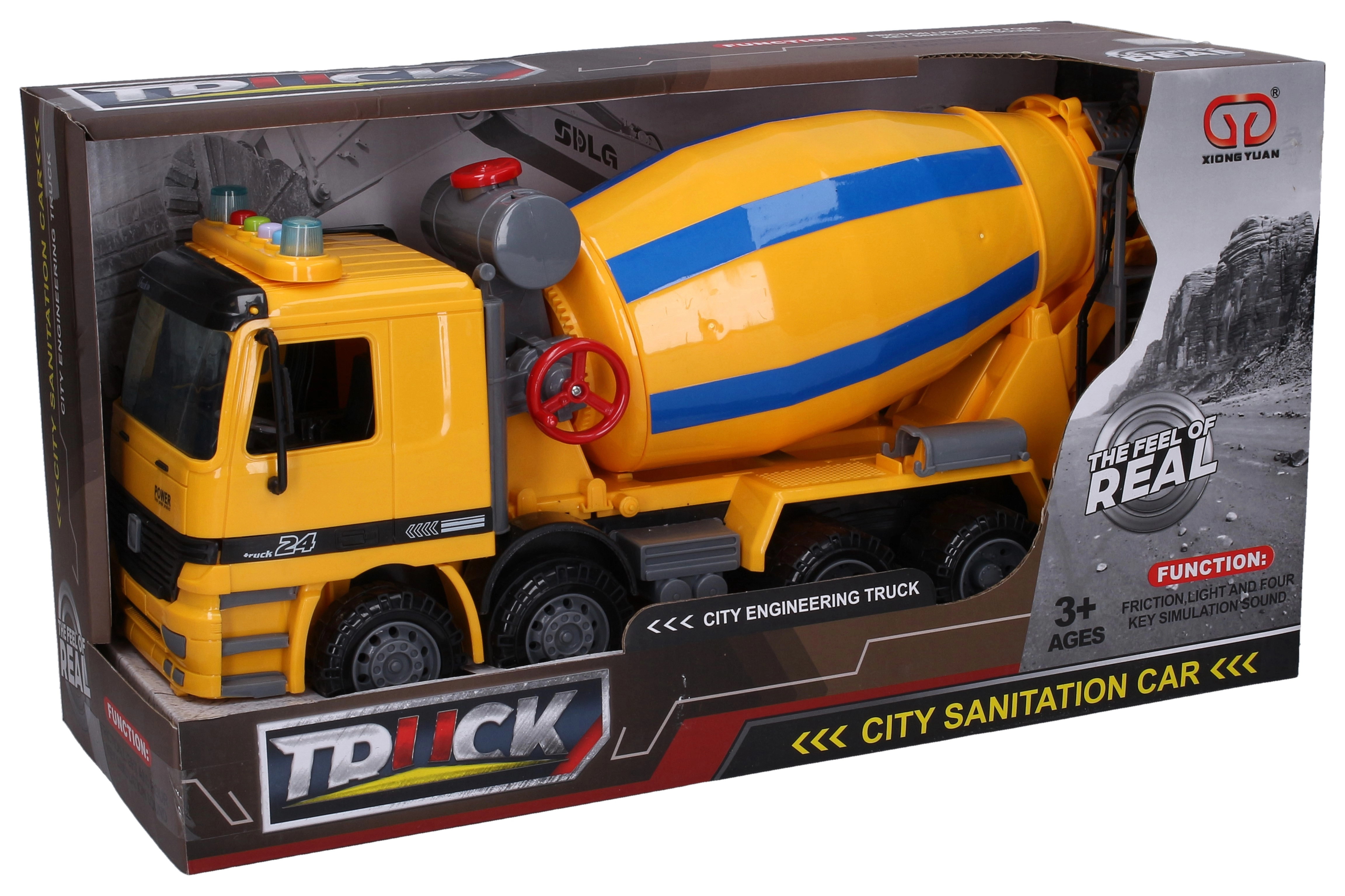 Betonieră auto realistă, lungime 40 cm, care îi va încânta pe micii constructori. Oferă mecanism cu inerție pentru rulare lină, efecte luminoase și sonore controlate prin butoanele de pe cabină și rezervor de amestecare rotativ acționat cu un rotiț la lateral.