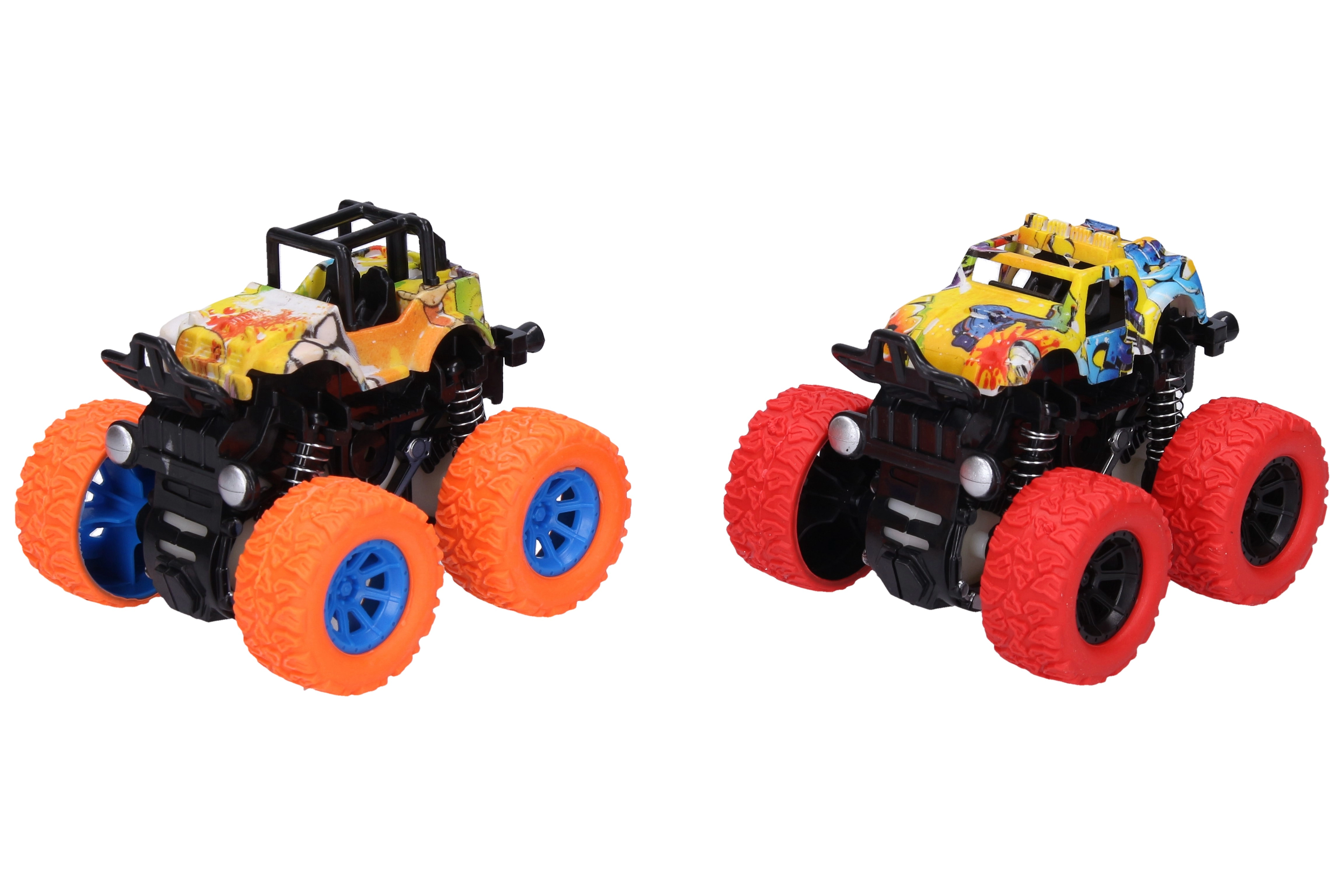 Aceste mașinuțe de teren de aproximativ 9 cm cu mecanism cu volantă (fricțiune) trebuie doar întinse și lăsate – pornesc înainte cu viteză mare. Caroserii stilate cu motive graffiti în diverse variante de culoare atrag atenția și stimulează jocul creativ.