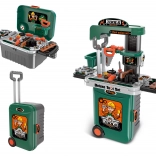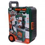 Set practic și distractiv pentru micii meșteri – troler pentru unelte pentru copii cu măsuță cu dimensiunea de 38 cm. Trolerul are roți și mâner telescopic pentru transport ușor și poate fi transformat în banc de lucru. Include accesorii bogate, precum unelte, șuruburi, roți dințate și menghină.