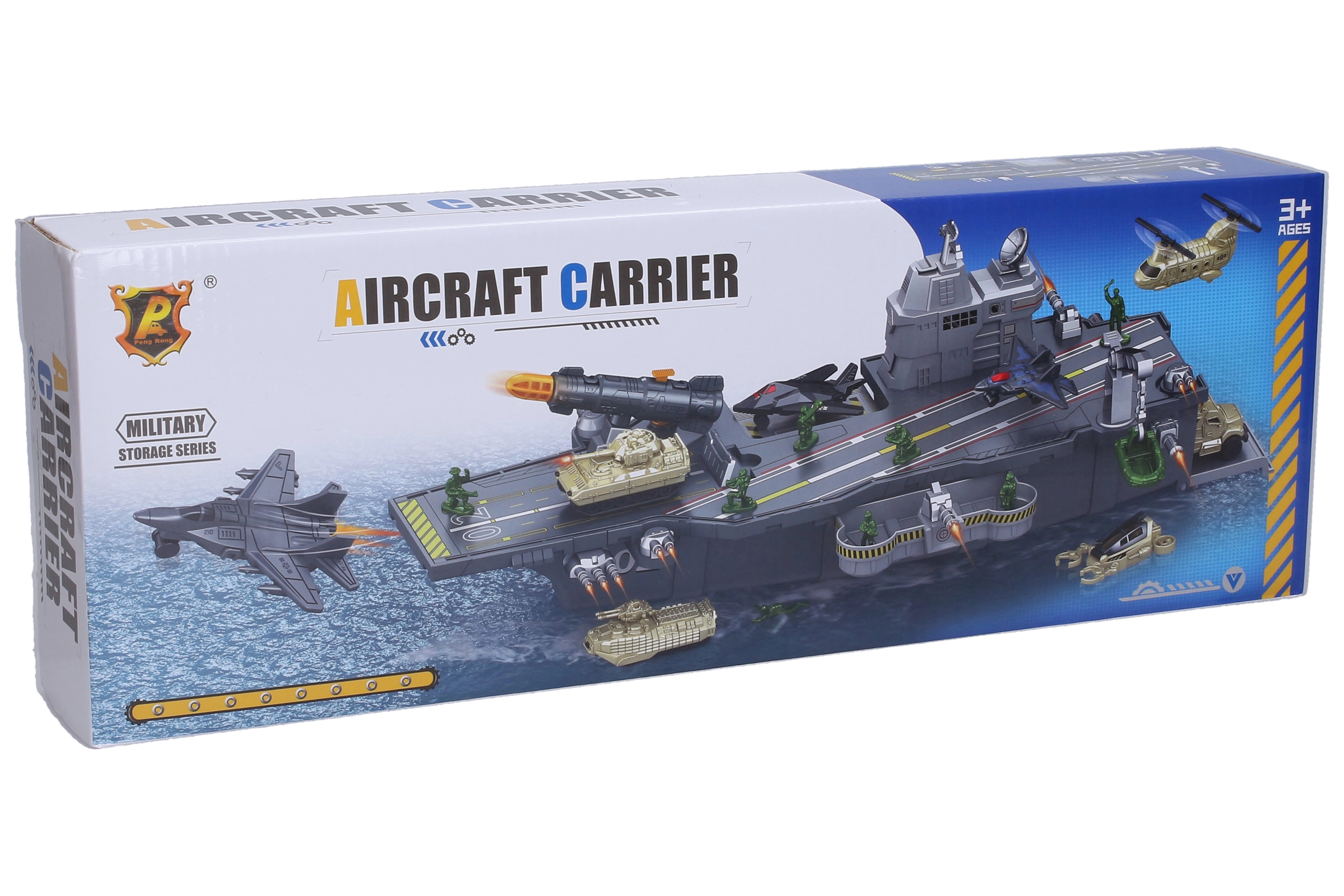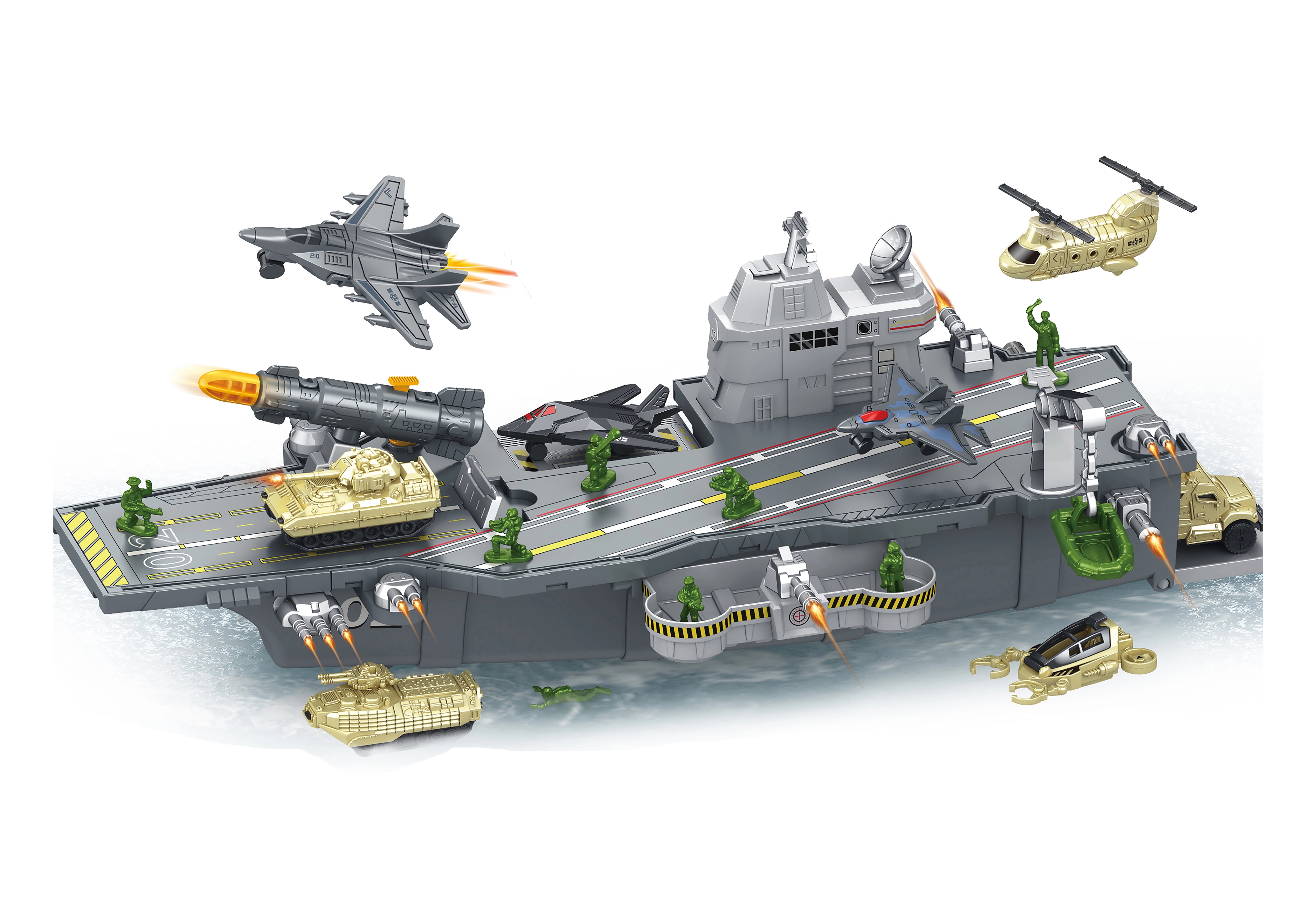 Descoperă lumea plină de acțiune a bătăliilor navale cu acest set detaliat de portavion cu lungimea de 47 cm, completat de vehicule și figurine de soldați. Setul oferă elemente mobile manual fără efecte de lumină și sunet, asamblare ușoară conform instrucțiunilor de pe ambalaj și dimensiuni compacte potrivite pentru joaca în casă.