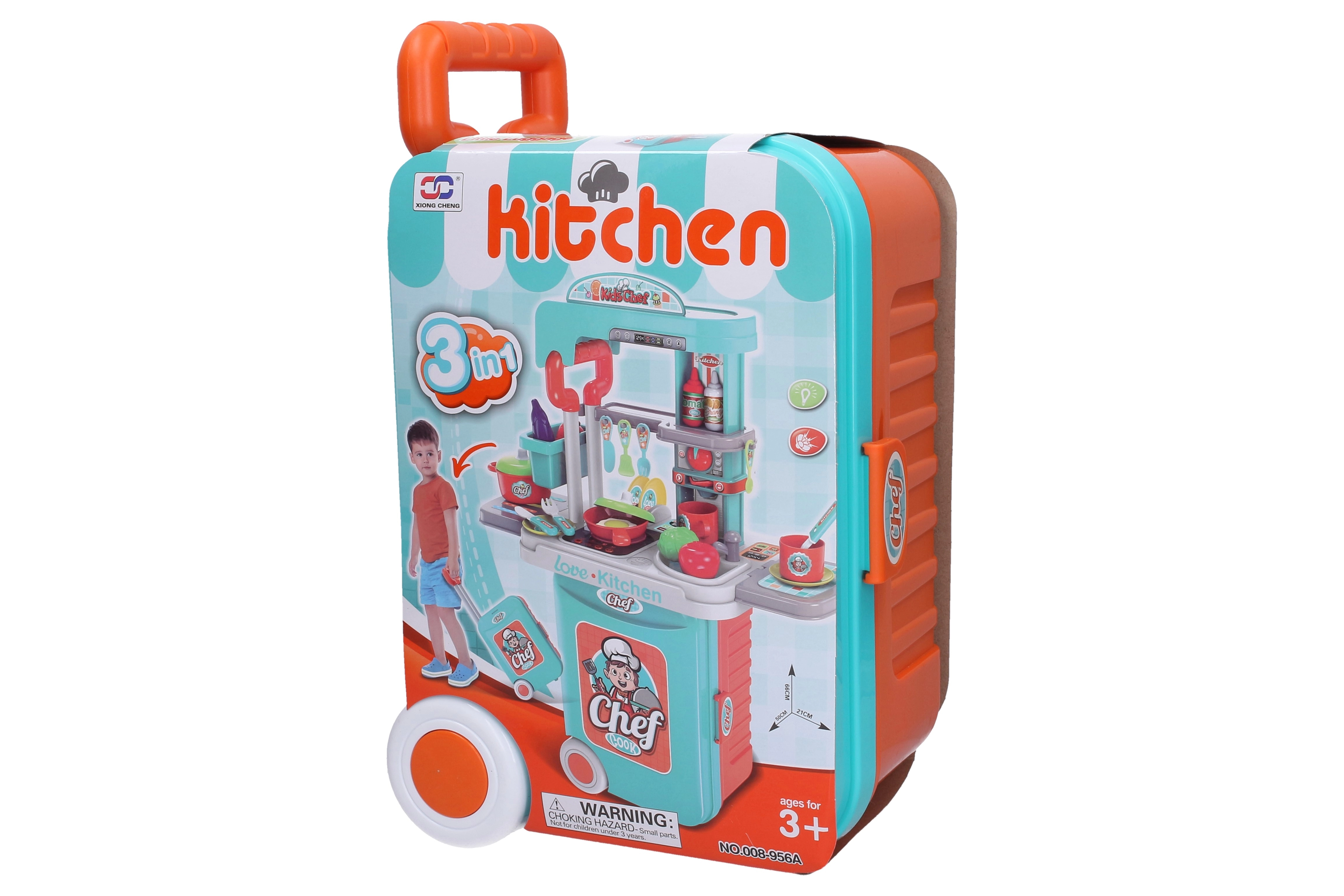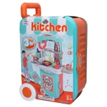 Bucătăria practică pentru copii sub formă de troler pe roți îi va încânta pe micii bucătari atât în călătorii, cât și acasă. Se montează ușor, oferă accesorii bogate și efecte luminoase și sonore ale plitei. Datorită mânerului extensibil și dimensiunilor compacte, este ideală pentru transport, transformându-se în câteva clipe într-o bucătărie completă.