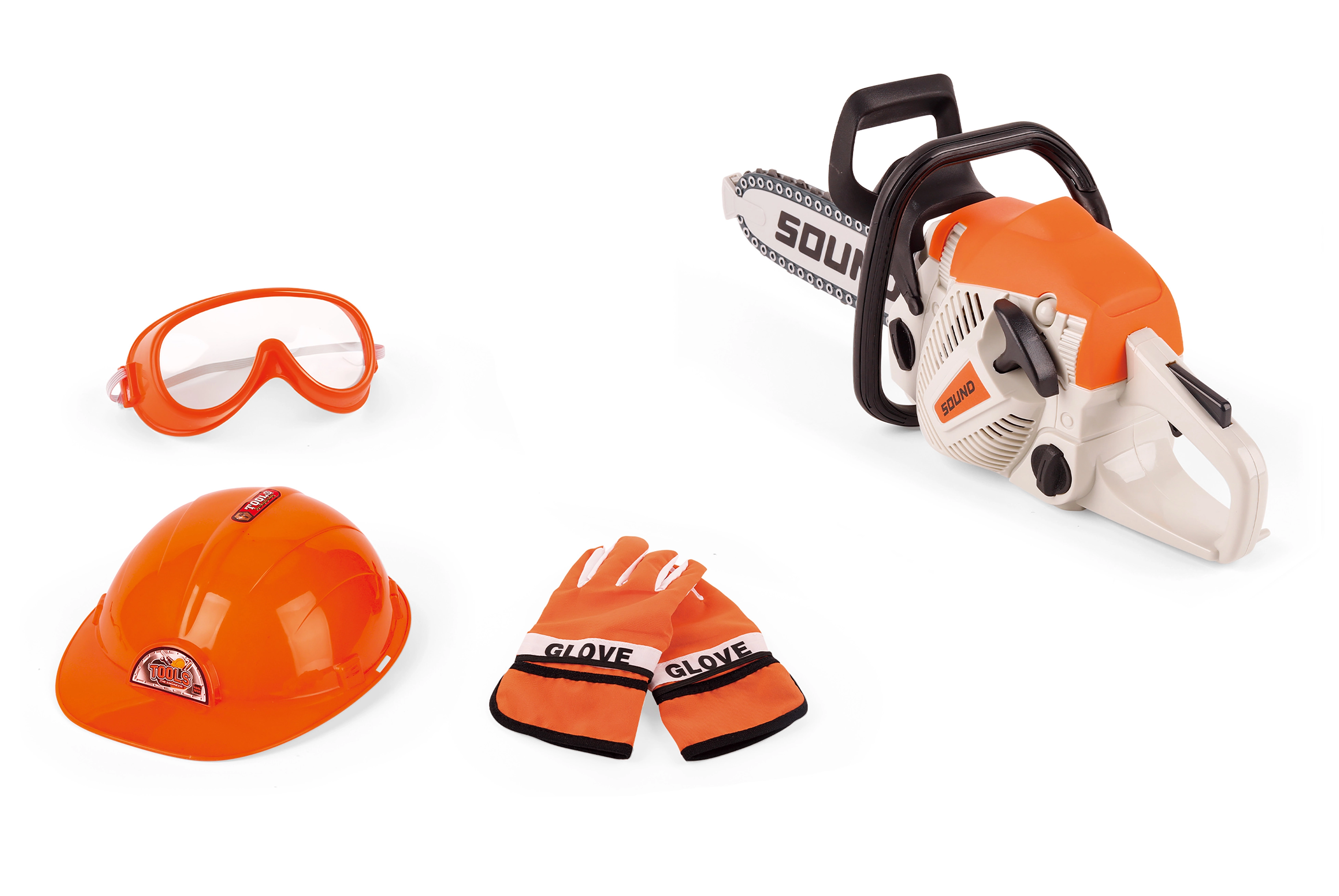 Pachetul conține echipamentul de bază – cască, mănuși și ochelari de protecție – care susține formarea unor obiceiuri corecte de siguranță în timpul jocului. Datorită lungimii compacte de 35 cm, drujba se ține confortabil în mână și este ușor de manevrat.