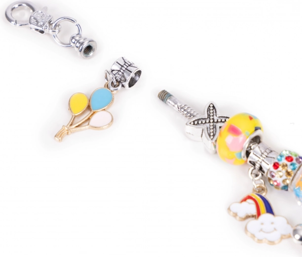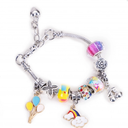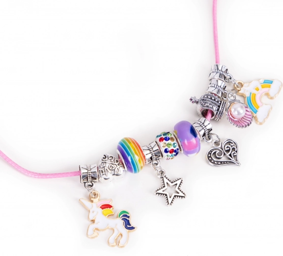 Un mix de mărgele pastel, sclipitoare și curcubeu este completat de pandantive argintii și emailate (inimi, stele, animăluțe, coroane) pentru combinații infinite.