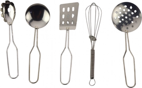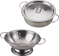 Pachetul include o gamă variată de vase și accesorii: oală cu capac, oală adâncă cu mânere, tigaie, strecurătoare/sită, tel, polonic, paletă perforată, paletă plină, spumieră, mănușă de bucătărie și prosop. Setul dezvoltă imaginația, susține jocul de rol, învață cooperarea și organizarea muncii în bucătărie.