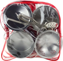 Setul de vase pentru copii, de calitate, din metal, imită fidel echipamentele reale de bucătărie – prin aspect și clinchetul caracteristic. Totul este organizat într-un rucsac transparent cu fermoar și mâner, astfel încât copiii își pot lua „comorile” de bucătărie în grădină, la prieteni sau în vacanță.