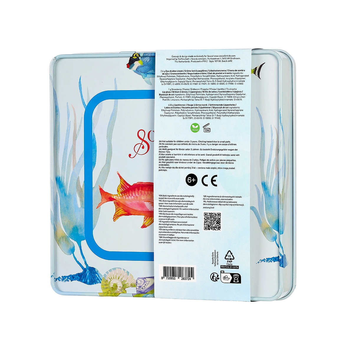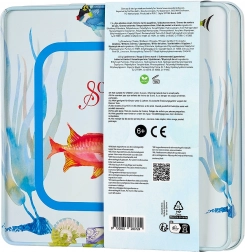 Elegant set de machiaj pentru copii în cutie metalică cu motiv de sirenă, care va încânta micile cochete de la 6 ani. Conține farduri de ochi sclipitoare (roz, auriu, albastru), 6 rujuri cremoase în nuanțe de roz și gloss lichid pentru buze cu aromă de căpșuni. Include aplicator dublu. Cosmeticele sunt testate dermatologic, ușor de spălat, 100% vegane și netestate pe animale.