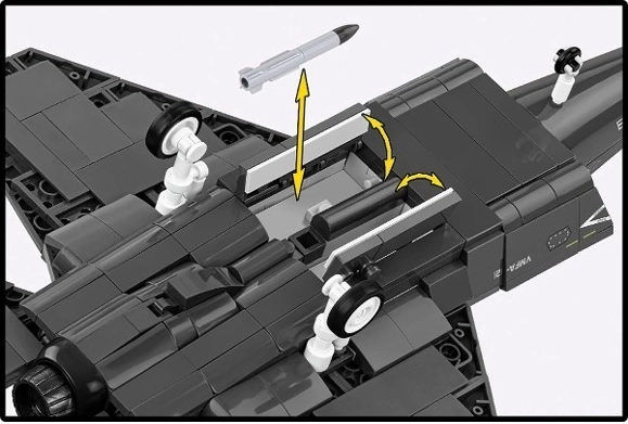 Setul conține 614 piese realizate cu precizie, cu imprimeuri rezistente, astfel încât aspectul rămâne de durată. Te vei bucura de cabina deschizibilă, cârmele și eleroanele poziționabile, roțile din cauciuc și compartimentul pentru bombe. Nu lipsesc suportul pentru expunere și figurina pilotului în echipament de zbor american.