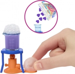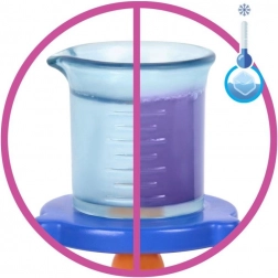 Setul conține un pahar special cu efect termocromic pentru jocuri cu schimbare de culoare și alte instrumente de laborator care susțin motricitatea fină, creativitatea și curiozitatea. Păpușa poartă o rochie tie-dye, adidași și un halat alb de laborator – pregătită pentru orice aventură științifică.