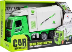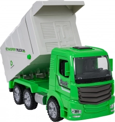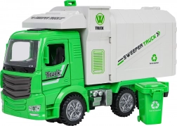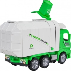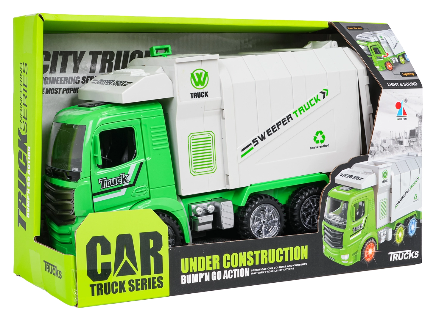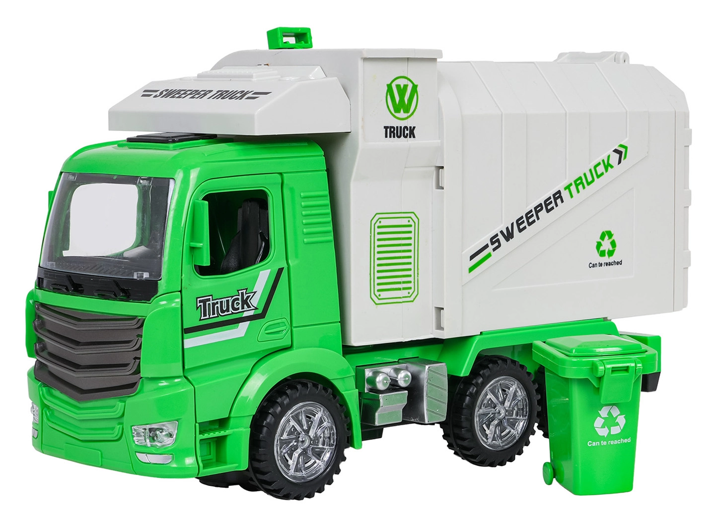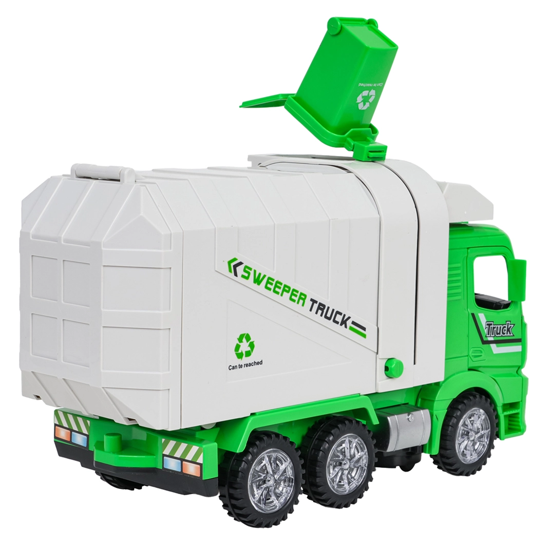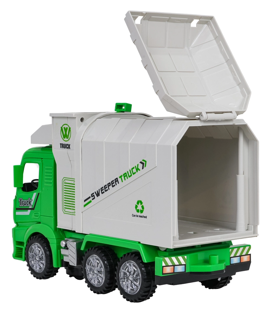 Efectele sonore precum rulare, frânare, claxon și melodie veselă transformă joaca într-o experiență realistă. Coșul de gunoi inclus se agață ușor de lateralul mașinii și îți permite să răstorni conținutul în încărcător. Jucăria este alimentată de 3× AA 1,5 V (nu sunt incluse).