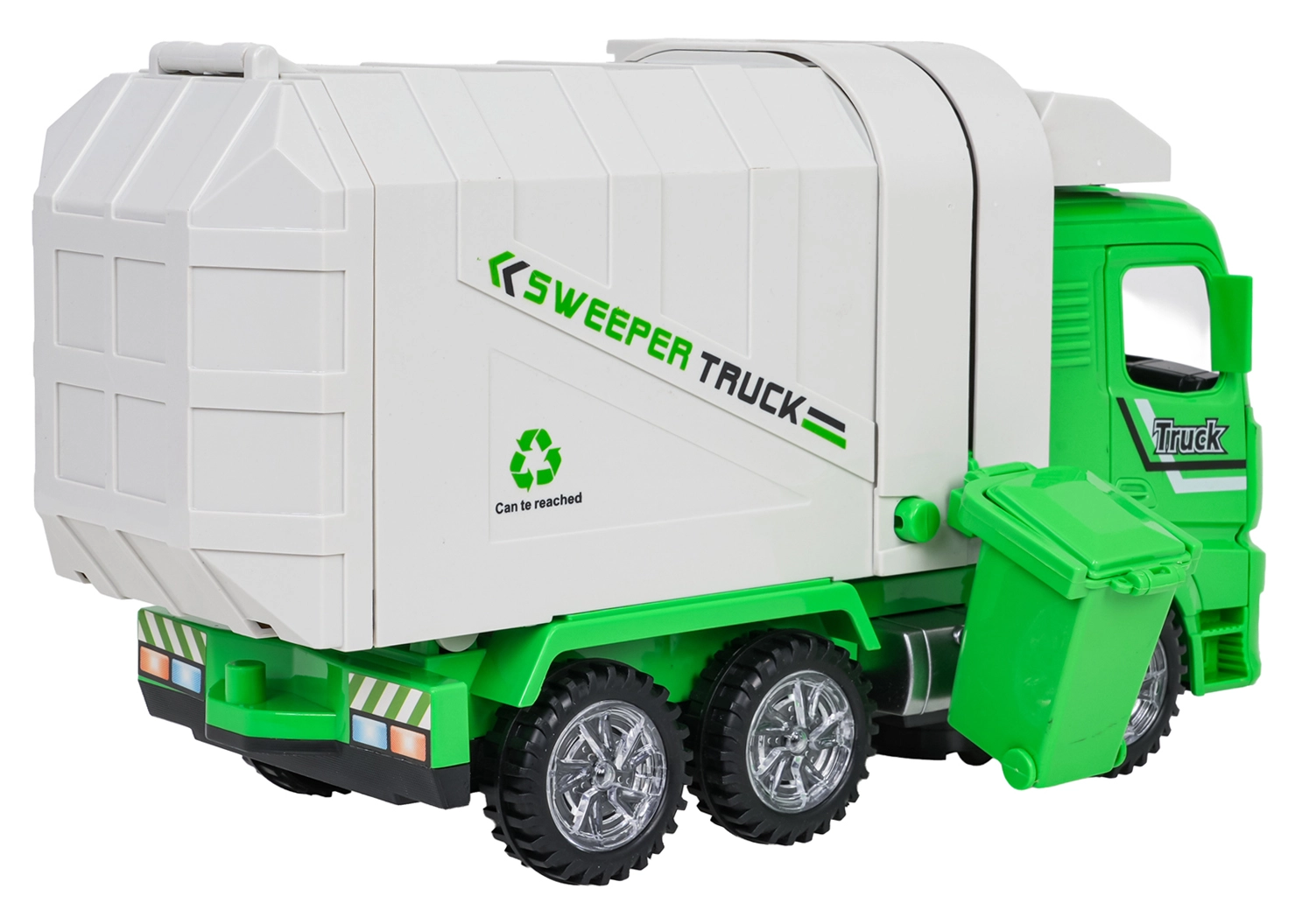 Mașina de gunoi interactivă din plastic de calitate îi va încânta pe toți micii pasionați de tehnică. Vehiculul se poate deplasa în toate direcțiile datorită rotiței pivotante inferioare, iar în timpul mersului strălucesc farurile frontale și roțile iluminate. Ușile cabinei se deschid, iar containerul poate fi ridicat și coborât, la fel ca și capacul său posterior.