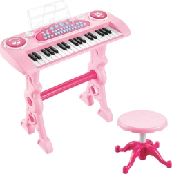Alimentarea duală este practică – pianino-ul funcționează pe baterii sau cu adaptor. Setul include un scaunel, pentru ca micuțul să ajungă confortabil la clape și să se simtă ca un adevărat artist.