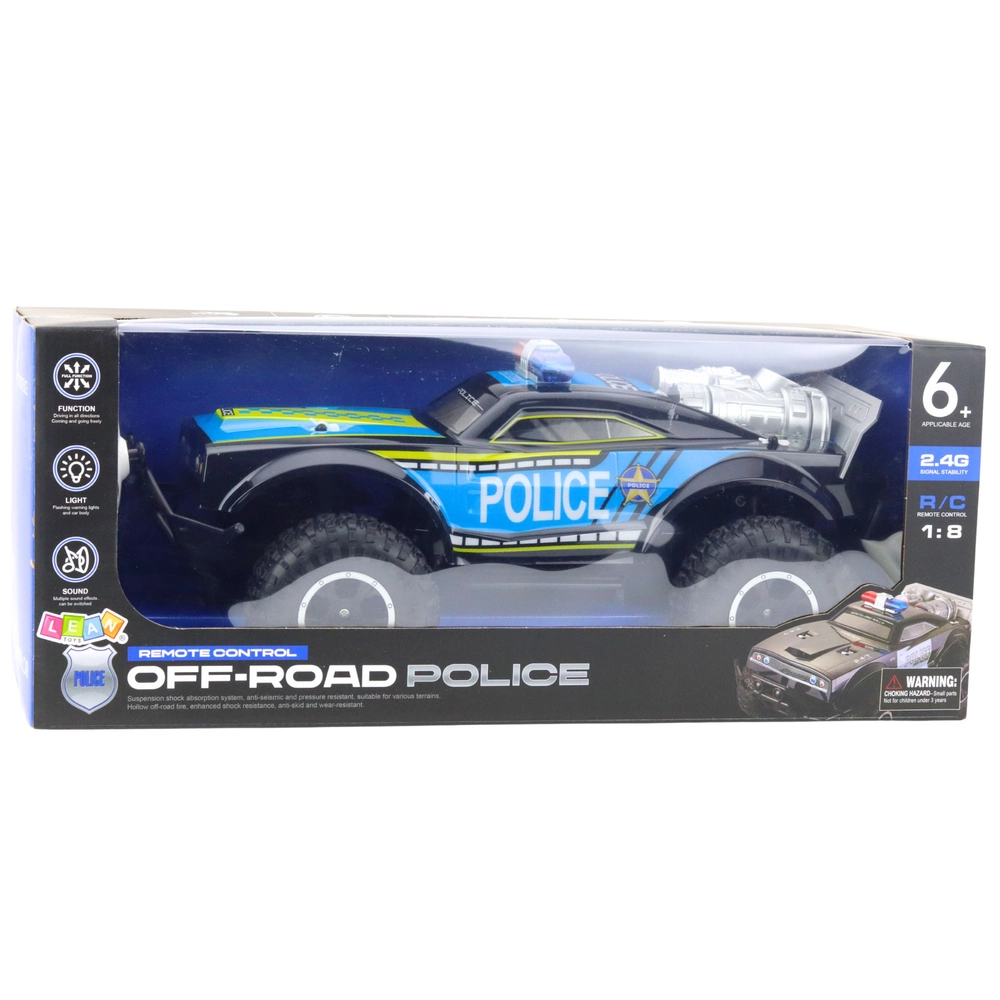 Mașina de teren de poliție RC rapidă și rezistentă, la scară 1:8, oferă distracție plină de acțiune pe șosea și în off‑road. Datorită motrizării puternice, anvelopelor din cauciuc, șasiului cu suspensie și frecvenței de 2.4 GHz, asigură o deplasare lină fără interferențe. Efectele luminoase și sonore realiste (girofaruri, sirenă, motor) intensifică fiecare urmărire polițienească.