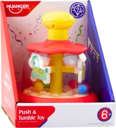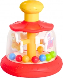 Carusel interactiv distractiv, tip guguluf, pentru cei mai mici, care, la apăsarea butonului superior, pune în mișcare elementele colorate și biluțele. O excelentă jucărie senzorială pentru dezvoltarea percepției vizuale și auditive și pentru antrenarea motricității fine și a coordonării mișcărilor.