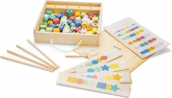 - Cutie din lemn cu capac, 56 de mărgele colorate, 8 carduri față-verso cu modele, 4 suporturi de sortare cu carduri, șnur pentru înșirare