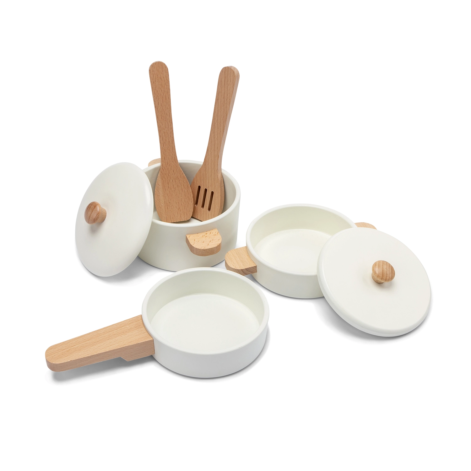 Acest set elegant de veselă din lemn pentru copii, în culoare albă, este completarea perfectă pentru orice bucătărie de jucărie. Include o oală cu capac, tigăi și ustensile din lemn, toate cu suprafețe netede și mânere plăcute, cu aspect natural, pentru o prindere sigură de către mâinile mici.