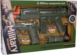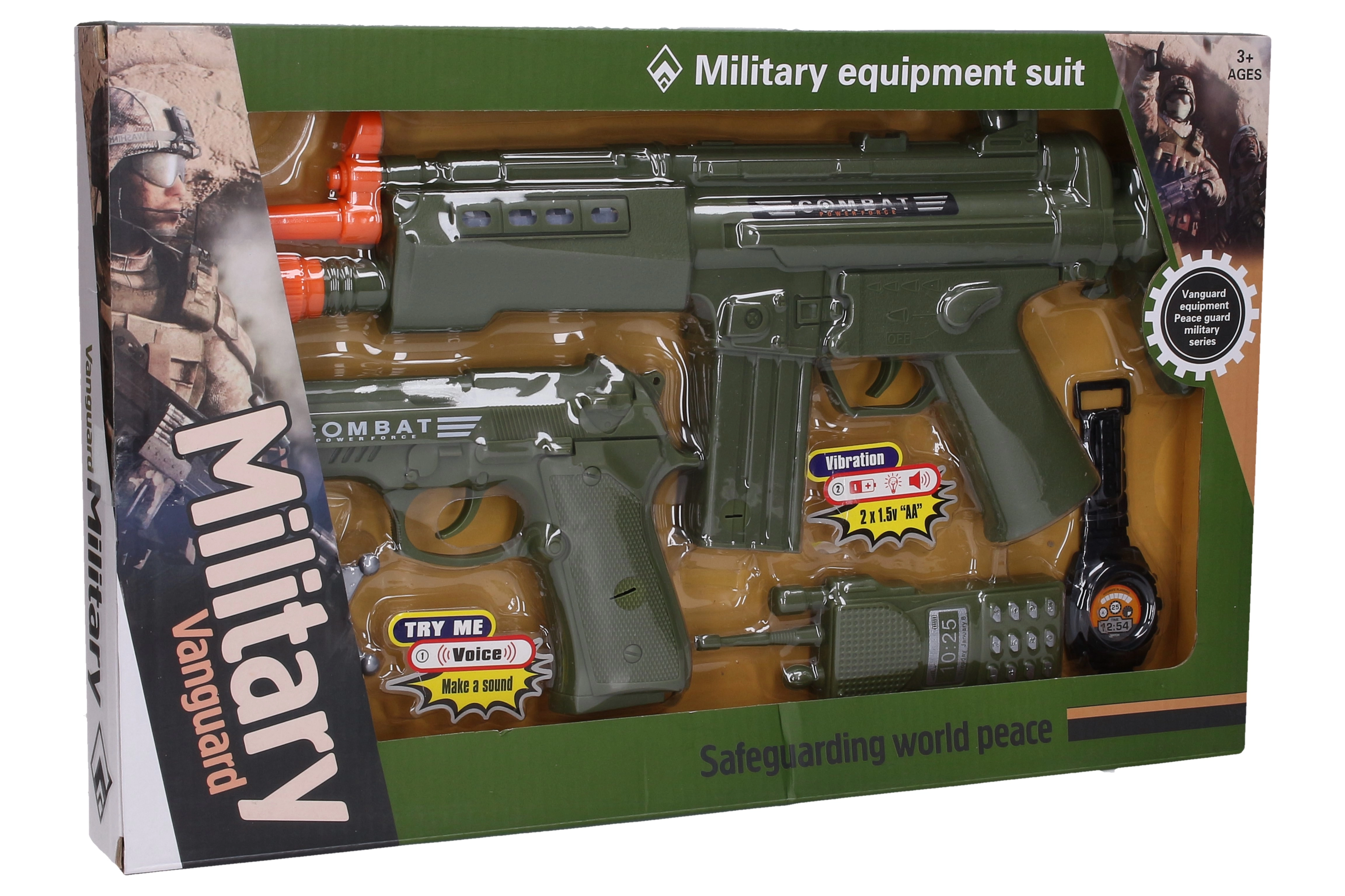 Set militar complet pentru micii aventurieri, conține o pușcă automată, un pistol, un ecuson, un walkie‑talkie și un ceas. Jucăria oferă efecte luminoase și sonore care intensifică experiența de joc. Pușca automată este alimentată de 2× baterii AA (incluse în pachet), astfel încât copiii pot începe să se joace imediat.