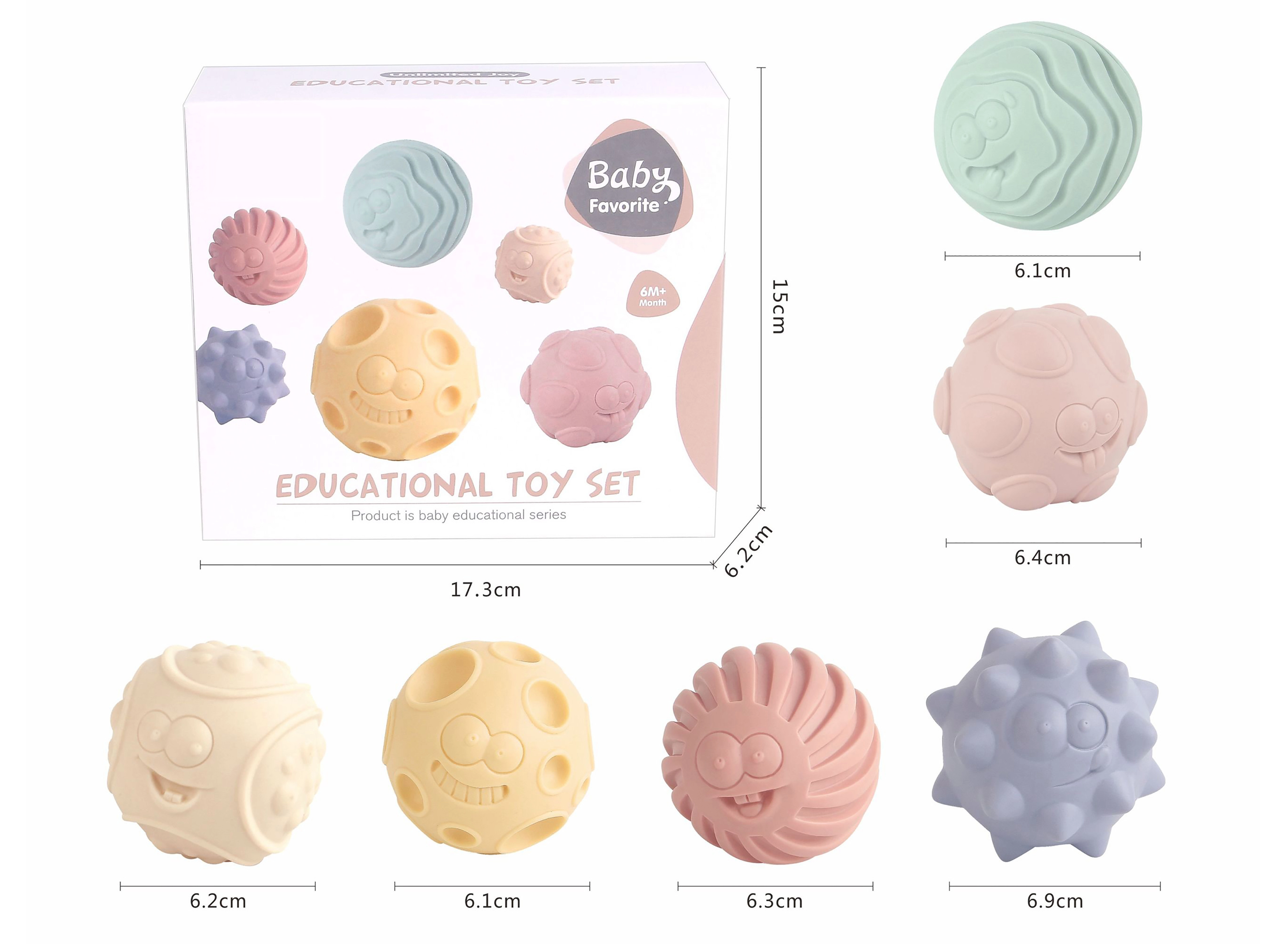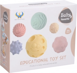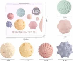 Set distractiv de mingi motrice pentru copii, care sprijină motricitatea fină, percepția senzorială și explorarea tactilă. Conține 6 mingi moi cu diametrul de 6 cm, cu texturi diferite, sigure pentru mâinile mici și care piuie la apăsare pentru o stimulare senzorială și mai mare.