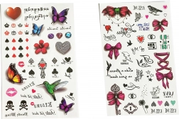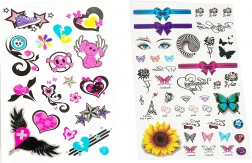 Descoperă lumea colorată a tatuajelor temporare pentru fete. Pe fiecare coală găsești zeci de motive drăguțe în mărimi diferite – de la fluturi și flori la inimioare, fundițe și steluțe. Datorită pașilor simpli, pot fi aplicate și de copii sub supravegherea adulților. Tatuajele sunt ideale pentru petreceri, carnavaluri, cadouri în pachețele de petrecere și ca accesoriu creativ pentru weekend.
