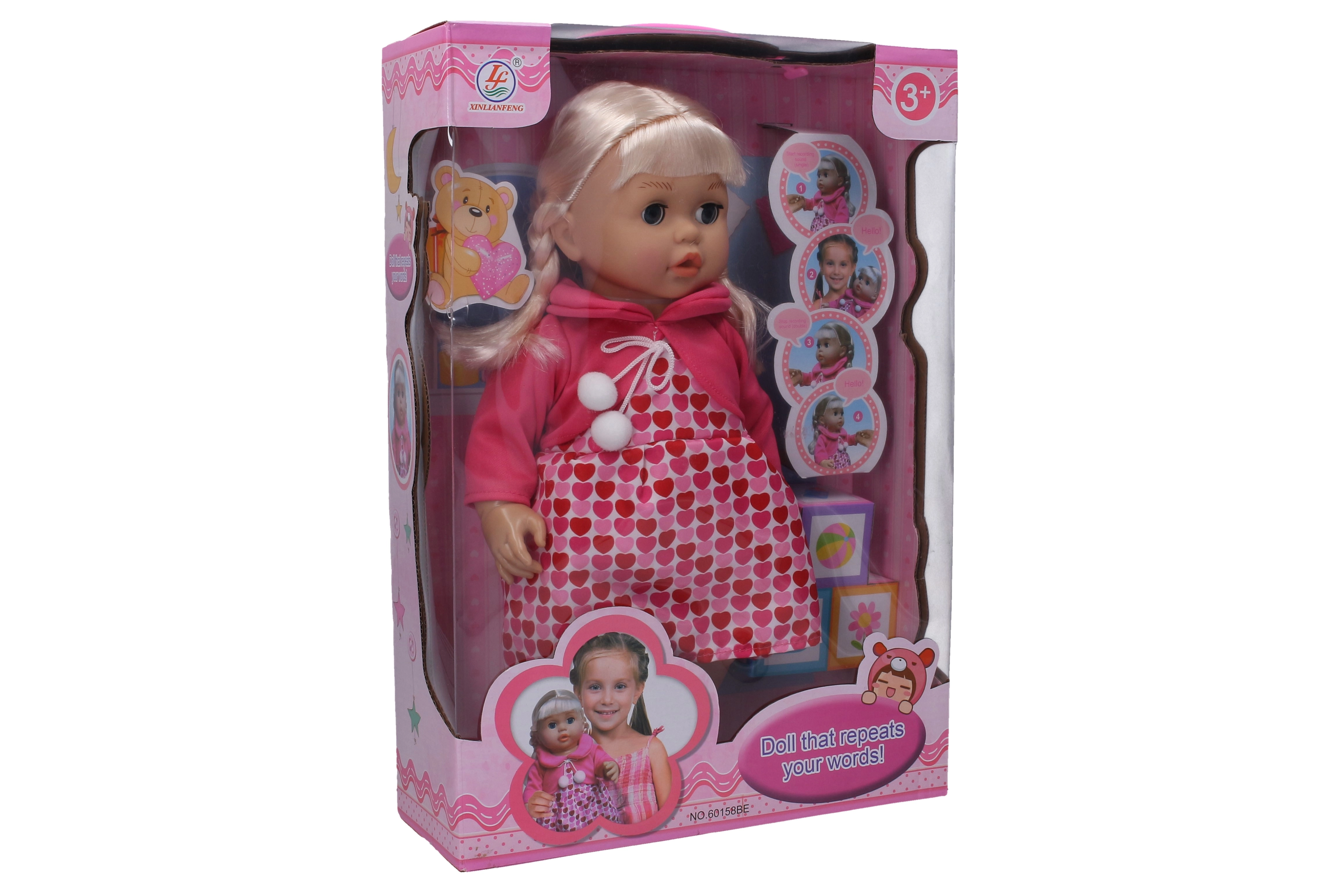 Păpușă distractivă care repetă ceea ce spui! La apăsarea mâinii drepte pornește înregistrarea, iar la apăsarea mâinii stângi păpușa redă mesajul tău. Dimensiune 40 cm. Jucărie interactivă pentru dezvoltarea vorbirii și distracție. Ușor de utilizat cu ajutorul butoanelor din mâini. 2× baterii AA nu sunt incluse.