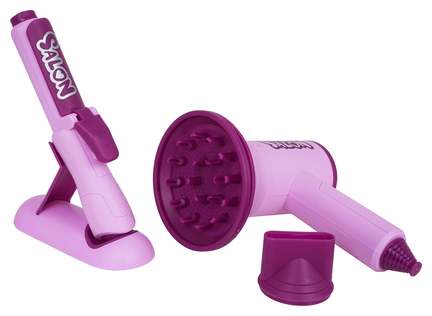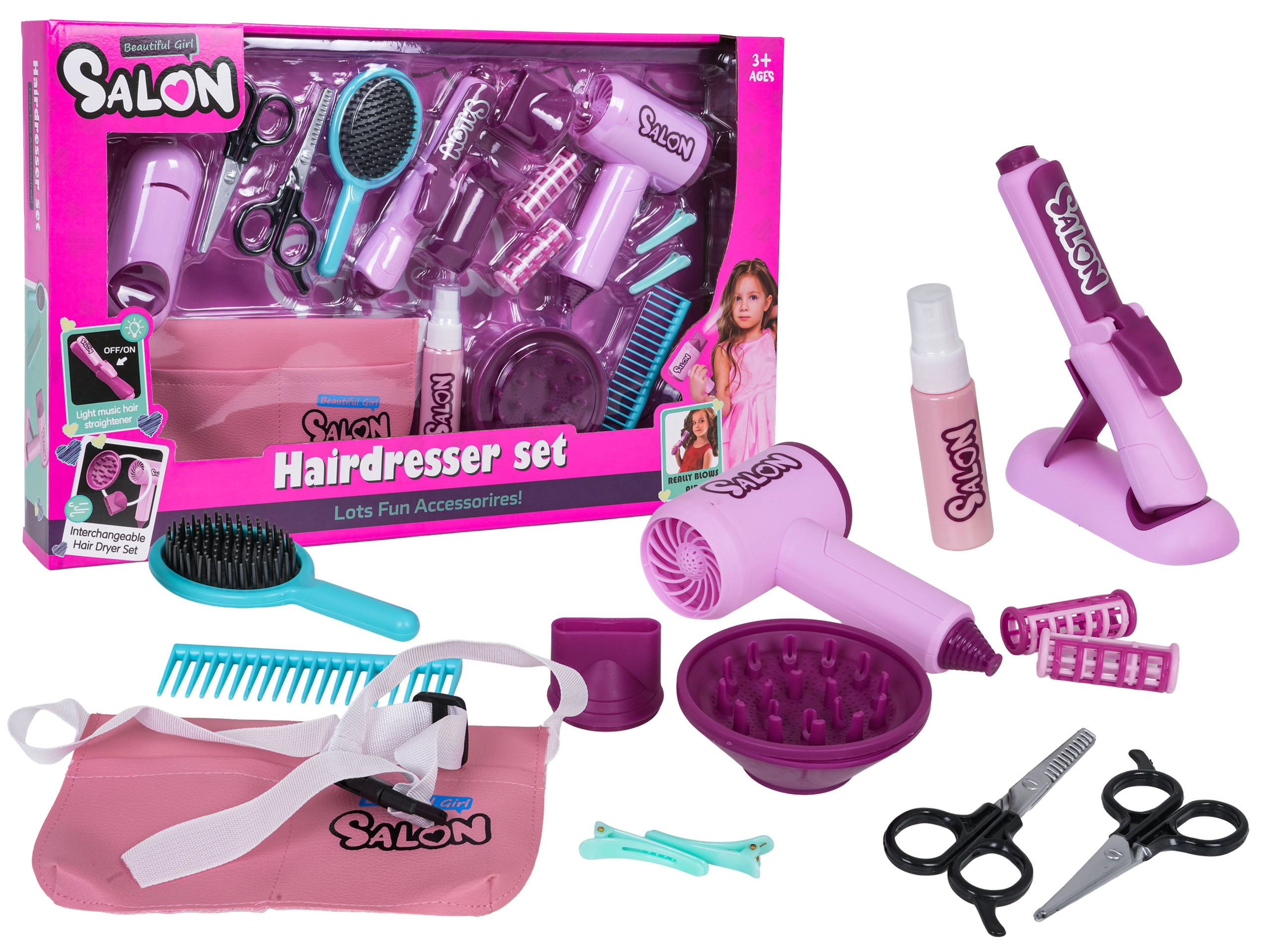 Descoperă magia propriului salon cu acest set bogat echipat pentru micile coafeze de la 3 ani. Include uscător de păr pentru copii funcțional cu capete interschimbabile, placă de păr cu iluminare, ondulator, pieptene, perie, agrafe, bigudiuri, foarfecă și o practică borsetă roz pentru brâu. Uscătorul emite sunet și are un „jet” ușor de aer, placa luminează – ideal pentru joc realist de-a salonul.