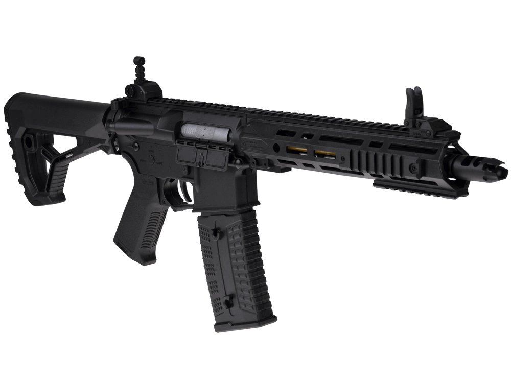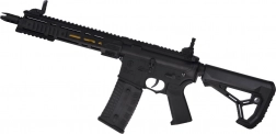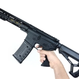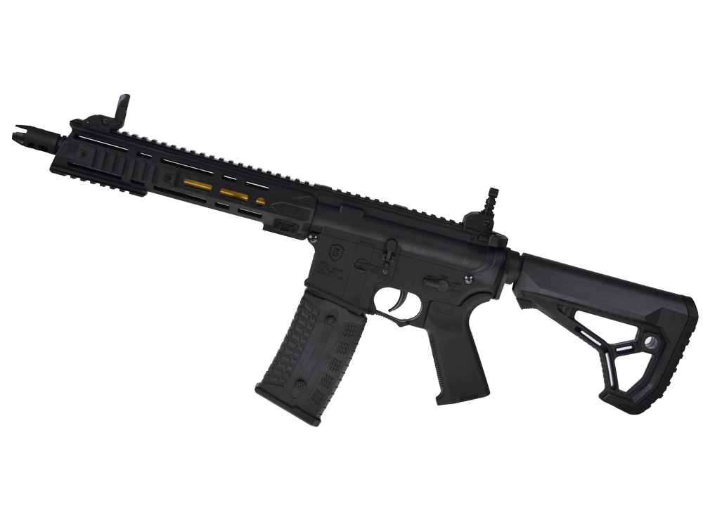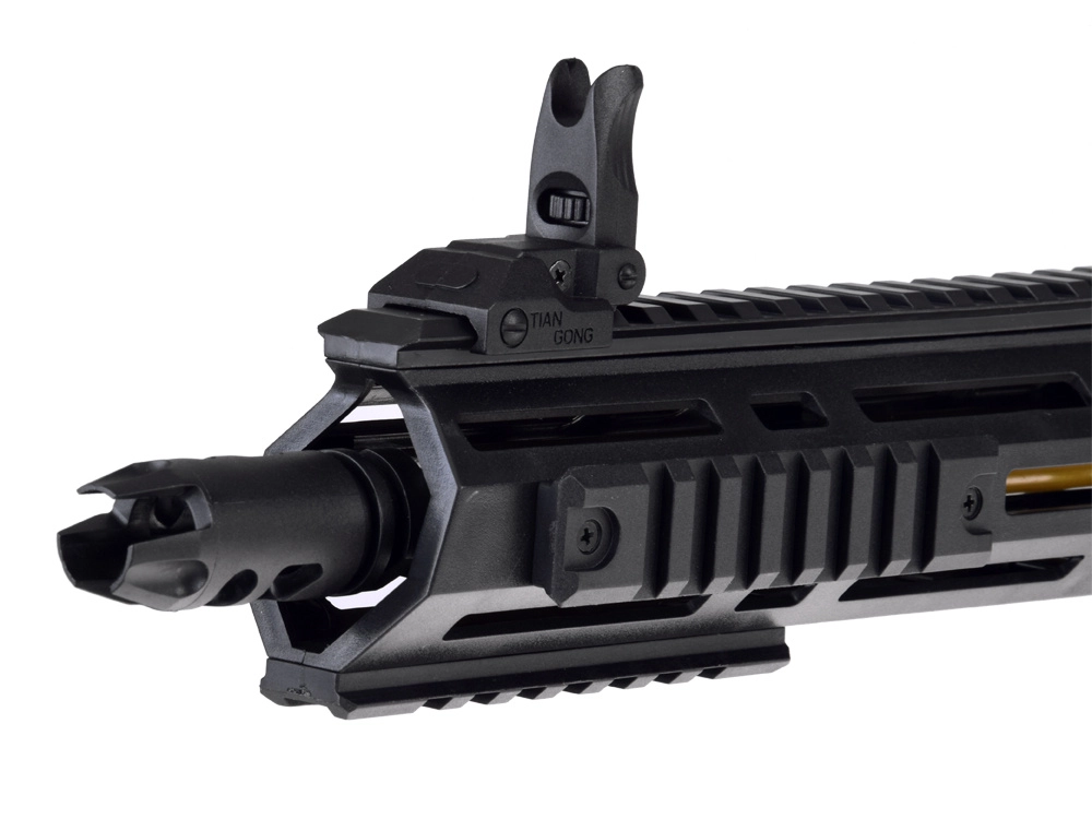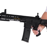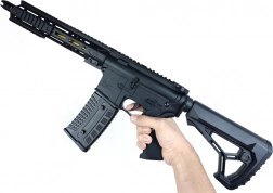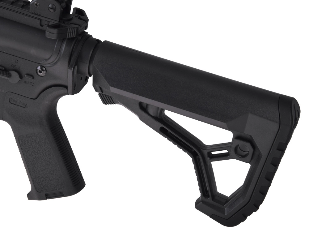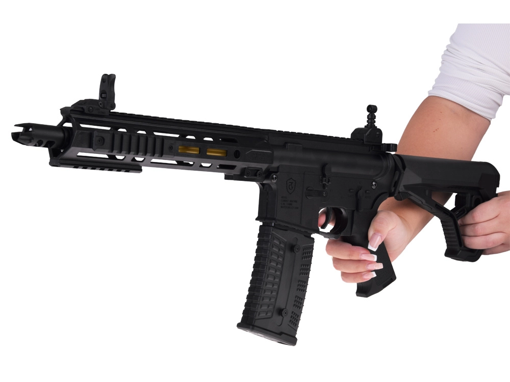 Handguard lung cu șine de montare, cătări rabatabile și pat reglabil care amplifică experiența de joc și îmbunătățesc ergonomia prinderii.