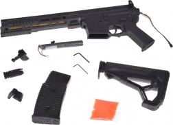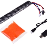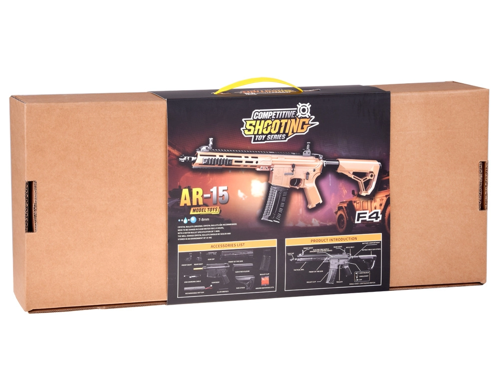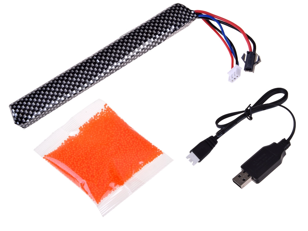- pistol cu gel F4, încărcător (magazie) bile, acumulator 7,4 V 1200 mAh, cablu USB, punguță cu bile de gel pentru preparare, cheie imbus, amortizor (decorativ), 2× cătări, pat