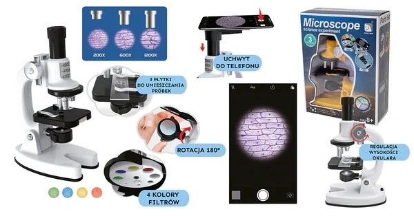 Descoperă lumea fascinantă din jurul nostru cu acest microscop de calitate pentru copii. Oferă 3 niveluri de mărire 200×/600×/1200×, 4 filtre colorate pentru contrast îmbunătățit și suport pentru telefon pentru fotografierea comodă a probelor. Cadoul ideal pentru micii exploratori și viitorii oameni de știință.