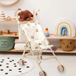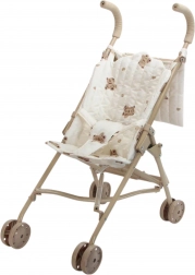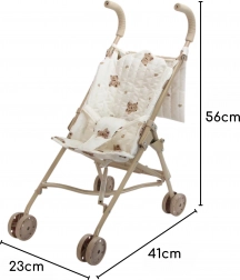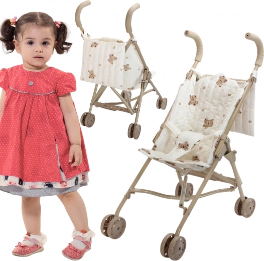 Acest cărucior stilat pentru păpuși îmbină confortul, siguranța și practicitatea plierii. Roțile duble permit o mișcare fluidă, în timp ce construcția solidă, dar ușoară, se pliază într-o clipă la o dimensiune compactă. Scaunul crem, cu model drăgălaș de ursuleți, adaugă farmec jocului și invită la noi aventuri, acasă și afară.