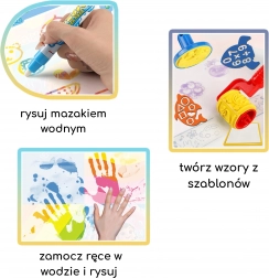 - Set bogat de accesorii – 3 markere cu apă, 3 ștampile, rola, șabloane, mașinuță