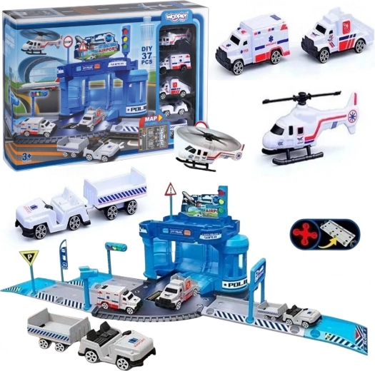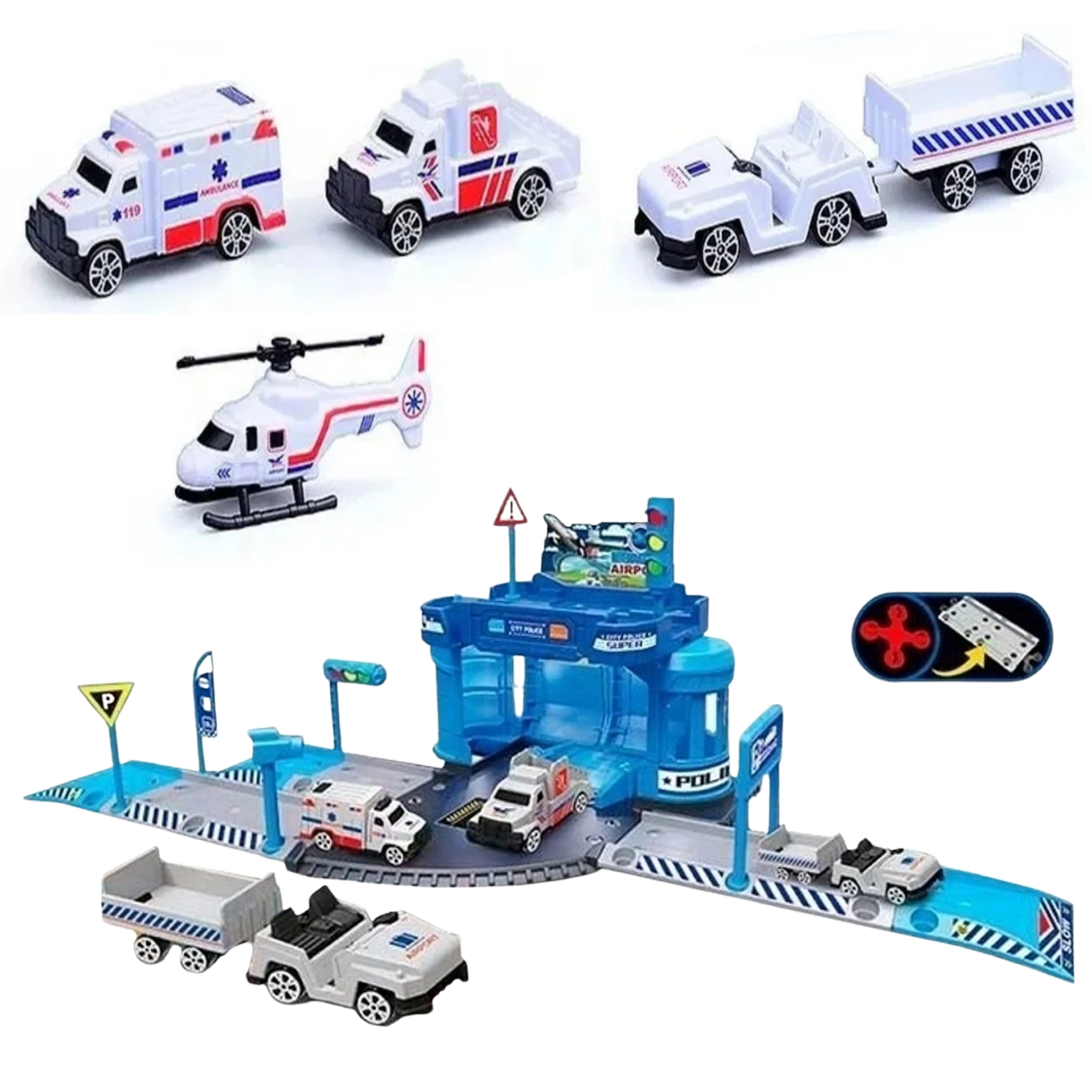 Setul conține o clădire pliabilă a stației, mașină de poliție, mic elicopter de poliție, autoscară de aeroport, vehicul cu remorcă pentru bagaje, indicatoare rutiere, elemente de alee de acces și un covoraș din folie 78 × 58 cm. Copiii își dezvoltă motricitatea fină, coordonarea mână–ochi și imaginația.