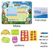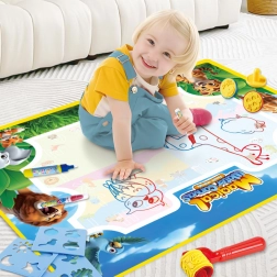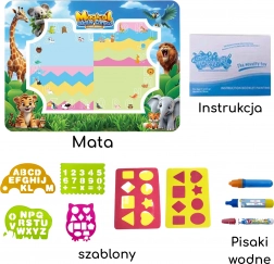 Pachetul conține tot ce ai nevoie: covoraș pentru desen cu apă, 3 markere reutilizabile cu apă, 4 șabloane, 2 ștampile și o cărticică ilustrată cu instrucțiuni. Excelent ca dar pentru micii artiști și preșcolari.