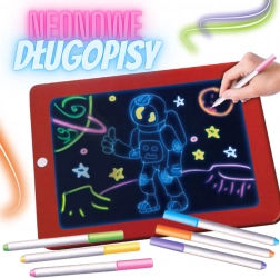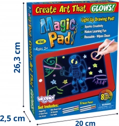 Tableta magică de desen WOOPIE transformă desenele copiilor în creații neon luminoase. Datorită iluminării LED cu 8 efecte, suprafeței lavabile și markerelor neon, desenatul, învățarea literelor și a calculelor devin curate, distractive și maxim creative.