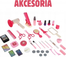 - Geantă-casetă cu mâner, 2 agrafe, 4 bigudiuri, burete pentru pudră, pulverizator/mist, 7 pensule de machiaj, 2 lacuri de unghii, „rimel”, „parfum”, fard de pleoape, „pudră”, ondulator, placă de îndreptat părul, suport pentru placă, pieptene, perie, oglindă, uscător de păr cu accesorii interschimbabile (difuzor și duză plată), terminal de plată, set de bani de jucărie, card de client fidel, card de plată, ambalaje din carton pentru cosmetice (șampon, balsam, gel), inscripție din carton „Beauty Salon”, 2 perechi de foarfeci, „ruj”