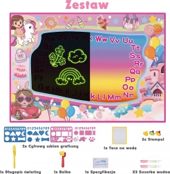 Pachetul conține: covoraș 2în1 (aprox. 100 × 70 cm), stilou UV, 2× marker cu apă, 2× șablon, rolă, 3× ștampilă și lavetă absorbantă.