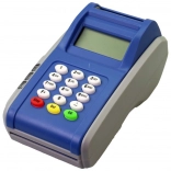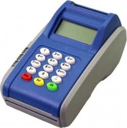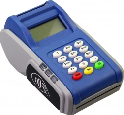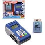 Micul ecran, tastatura numerică și butoanele funcționale colorate îi învață pe copii să introducă sume și să confirme plăți într-un mod ludic.