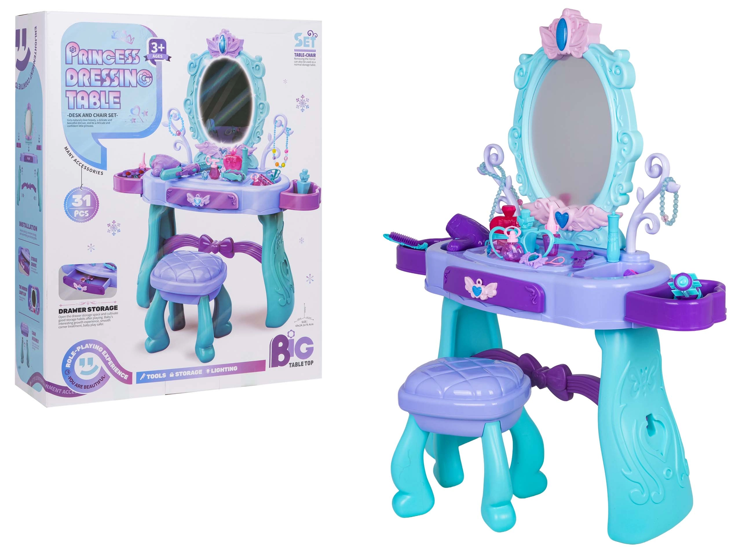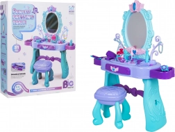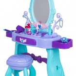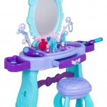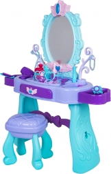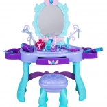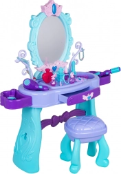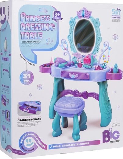 Măsuță de toaletă stilată pentru copii cu oglindă mare, iluminare și un set bogat de accesorii pentru joc creativ. Include scăunel, sertar și rafturi laterale pentru accesorii. În pachet găsiți foehn, ondulator cu plăci, piepteni, ochelari, bijuterii și accesorii de machiaj. Pentru lumina oglinzii sunt suficiente 2× baterii AA (nu sunt incluse). Ideal cadou pentru micile prințese de la 3 ani.