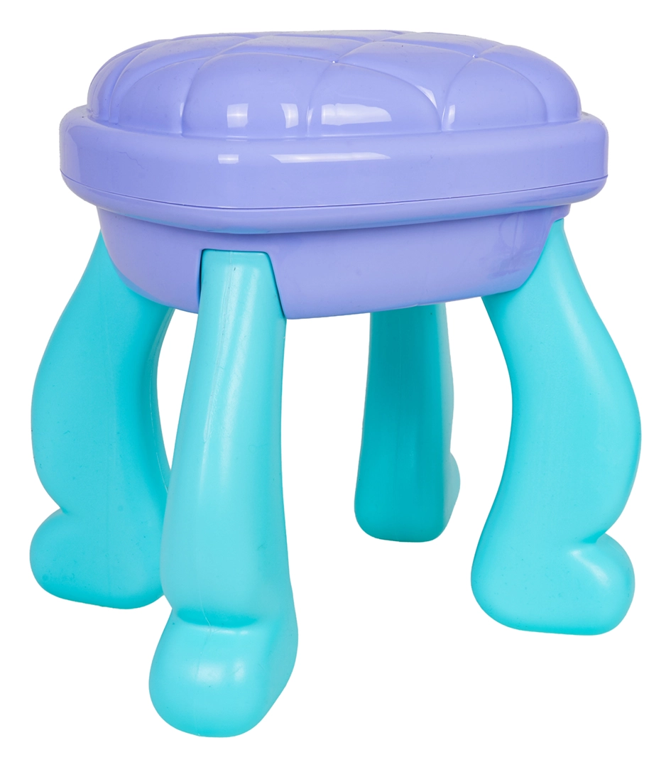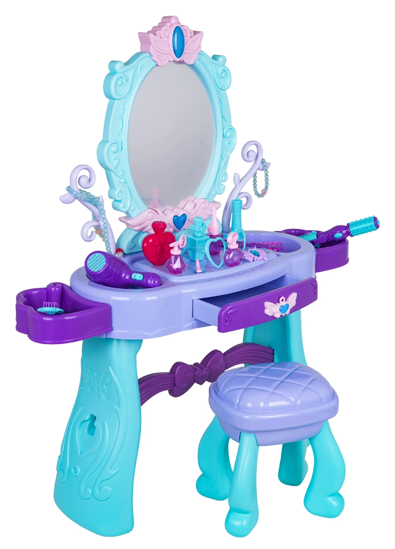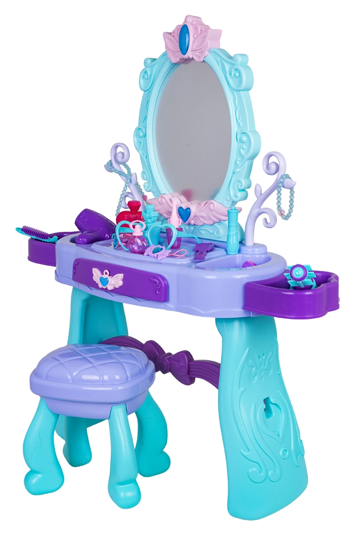 Oferiți-le copiilor propriul lor colțișor magic de frumusețe. Această măsuță de toaletă în combinație de turcoaz și mov oferă oglindă ovală mare cu iluminare, sertar practic și suprafețe laterale de depozitare pentru toate accesoriile. Scăunelul stabil asigură o ședere confortabilă și un joc în siguranță.