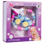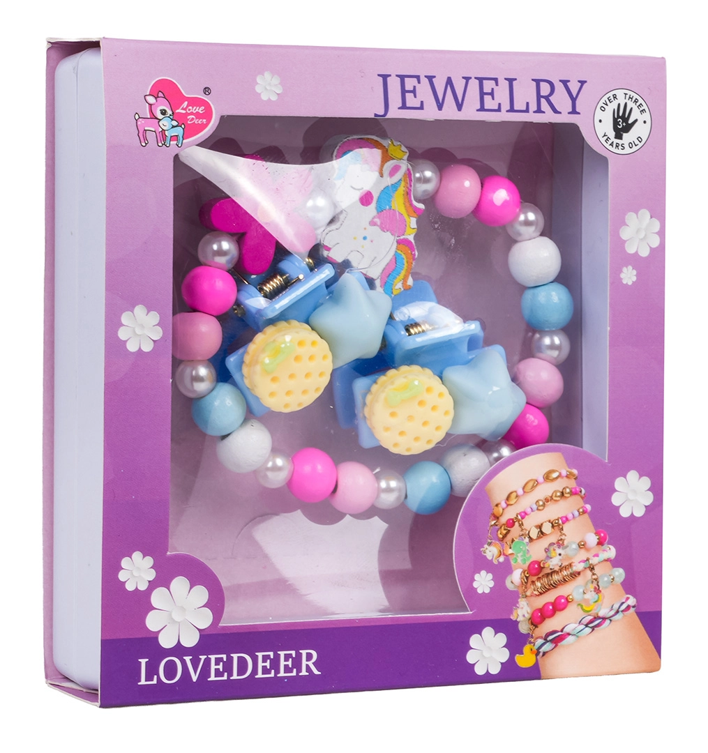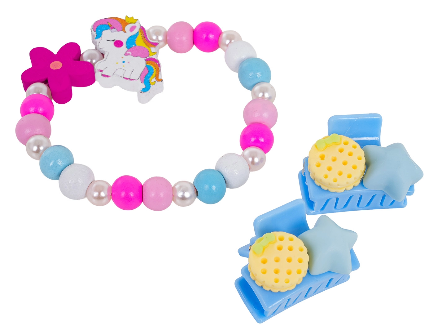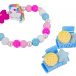 Descoperă setul jucăuș de bijuterii cu unicorn, care combină mărgele colorate, perlute și accesorii asortate pentru păr. Brățara elastică se pune cu ușurință, agrafele prind sigur șuvițele fine, iar întregul set este grozav pentru ținute de zi cu zi și pentru momente de sărbătoare.