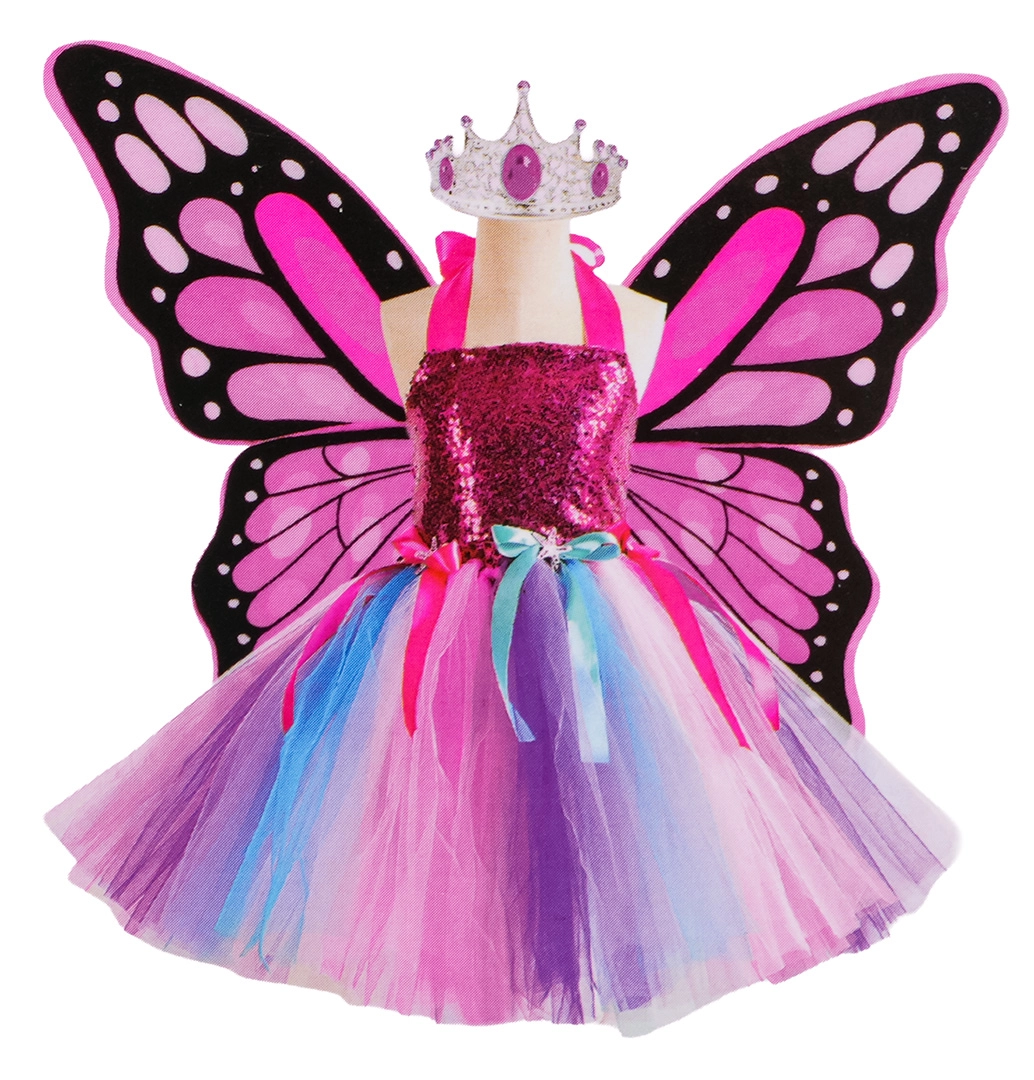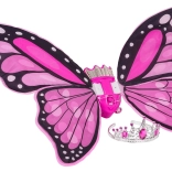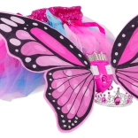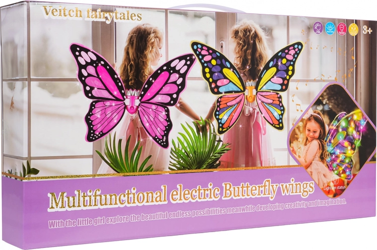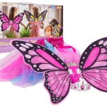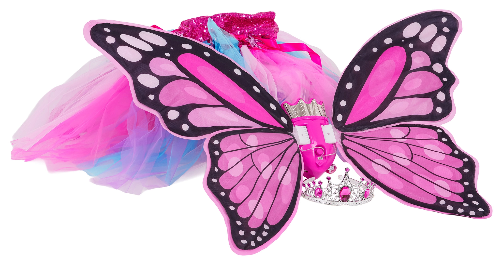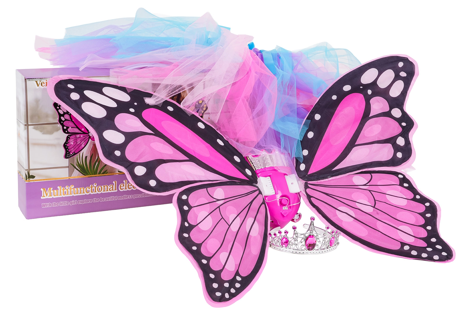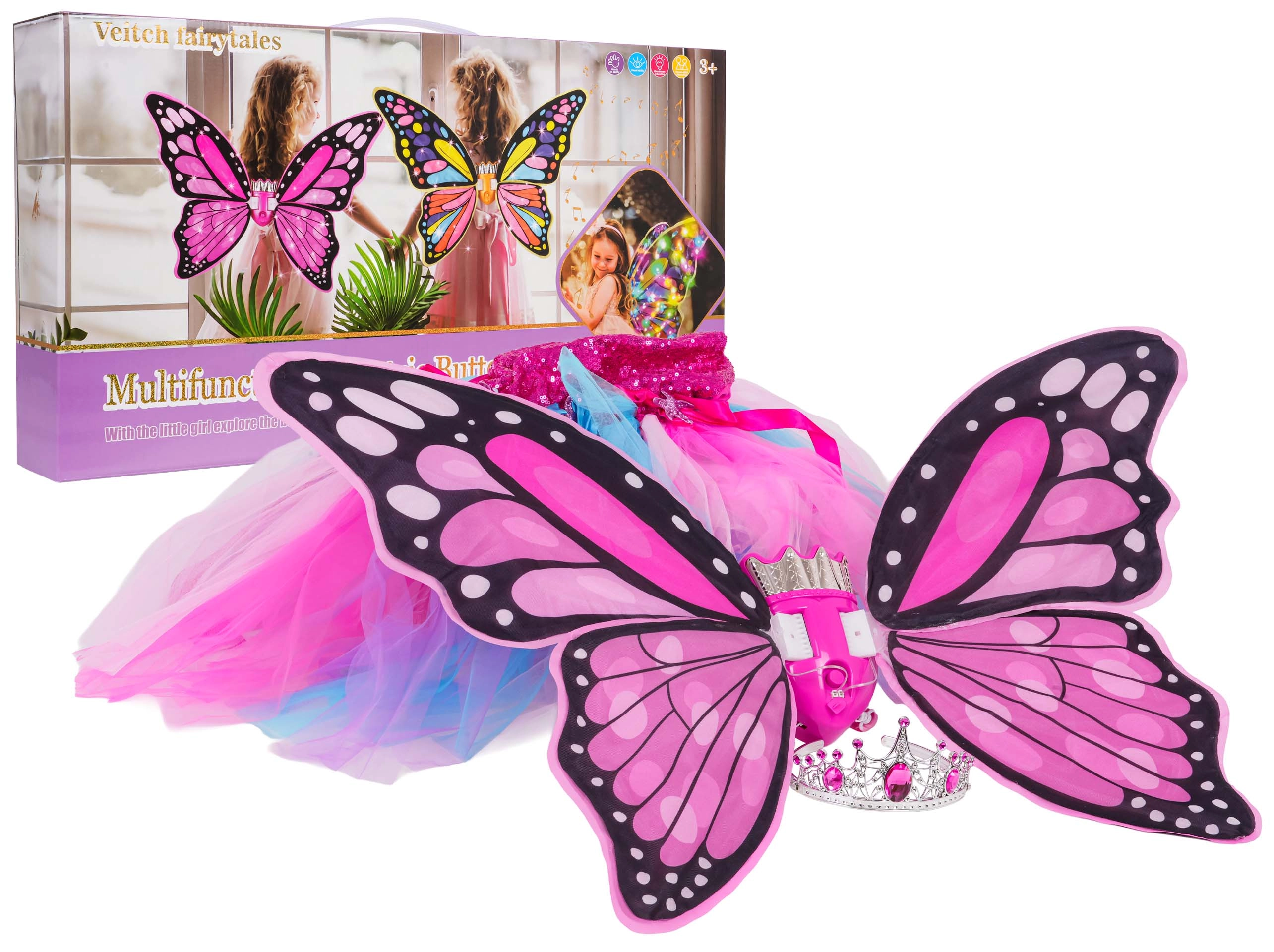 Aprinde imaginația copiilor cu acest set fermecat – aripi mari roz de fluture cu lumini și sunete, rochie din tul în culorile curcubeului și o coroniță strălucitoare. Datorită bretelelor reglabile, materialelor ușoare și mai multor moduri ale aripilor, costumul este ideal pentru carnaval, spectacole și jocuri de rol de zi cu zi.