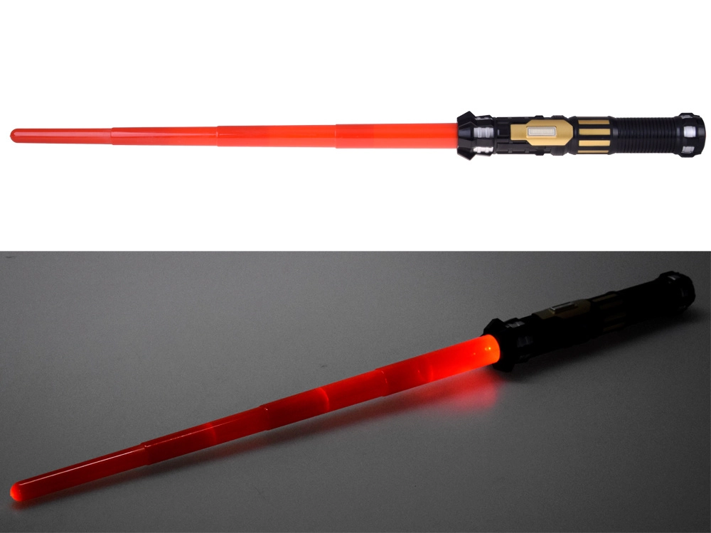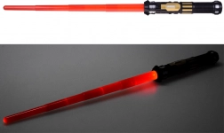 Lamă roșie iluminată și sunete dinamice care transformă fiecare luptă într-o experiență cinematografică.