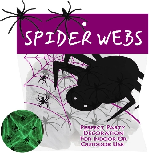 Decorațiune de Halloween stilată, care creează o atmosferă misterioasă. După expunere la lumină, pânza de păianjen fosforesce în întuneric cu o strălucire verzuie și arată extrem de realist. Sunt incluse 20 de păianjeni, care amplifică efectul de teamă. Potrivită pentru Halloween, petreceri tematice, scenografie și ședințe foto.