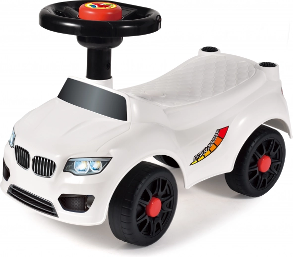 Trotinetă albă fără spătar, ușoară și stabilă, pentru cei mai mici. Oferă manevrare simplă, construcție solidă și dimensiuni compacte 50 × 21,5 × 33 cm – ideală pentru interior și exterior.