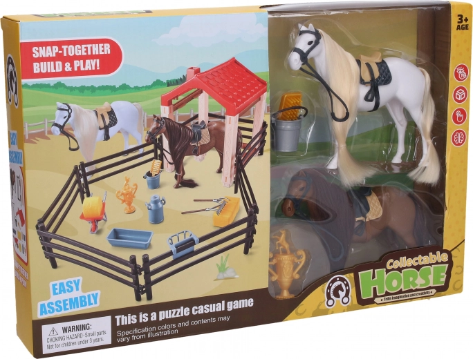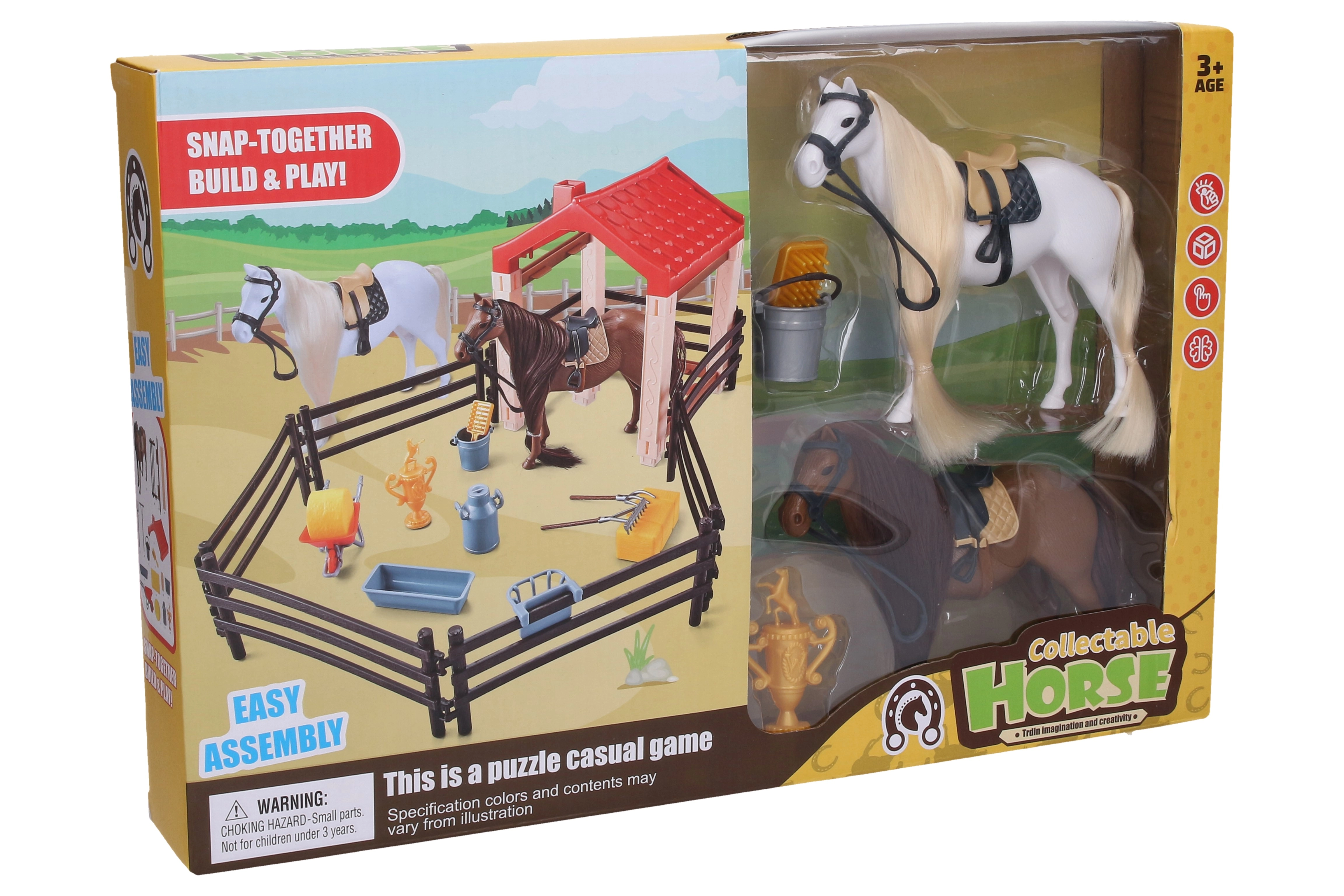 Acest set creativ oferă tot ce au nevoie micii iubitori de cai pentru a crea propriul țarc. Două figurine de cai detaliate (aprox. 14 cm) sunt completate de un țarc cu adăpost și accesorii pentru îngrijirea cailor, datorită cărora copiii pătrund ușor în lumea poveștilor de la fermă.
