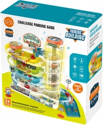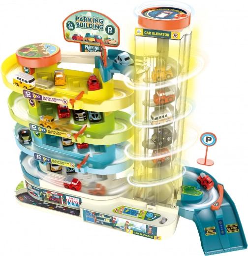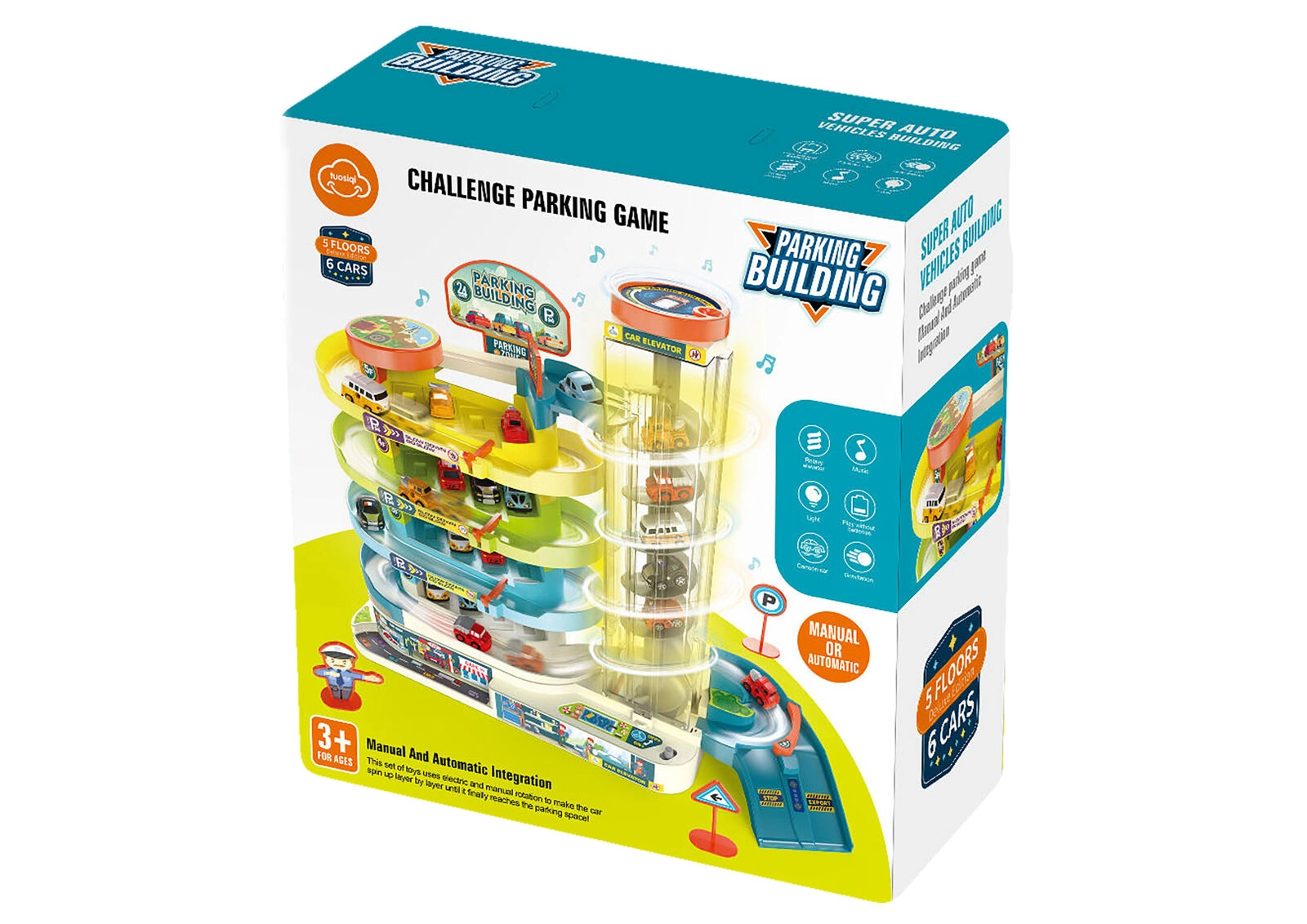 Această parcare pe niveluri oferă copiilor ore întregi de distracție creativă. Liftul funcțional poate fi utilizat pe baterii sau manual (comutator), astfel încât copiii își pot alege modul de joacă. Efectele luminoase și sonore adaugă și mai multă autenticitate parcării și deplasării mașinuțelor.