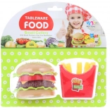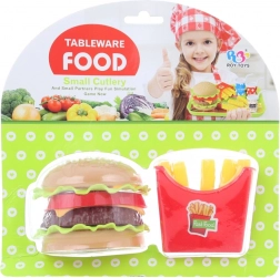 Set distractiv pentru micii bucătari: hamburger și cartofi prăjiți din plastic. Ingredientele individuale pot fi suprapuse pentru a crea combinații proprii. Ideal pentru dezvoltarea imaginației, motricității fine și jocurilor de rol. Potrivit pentru copii de la 3 ani.